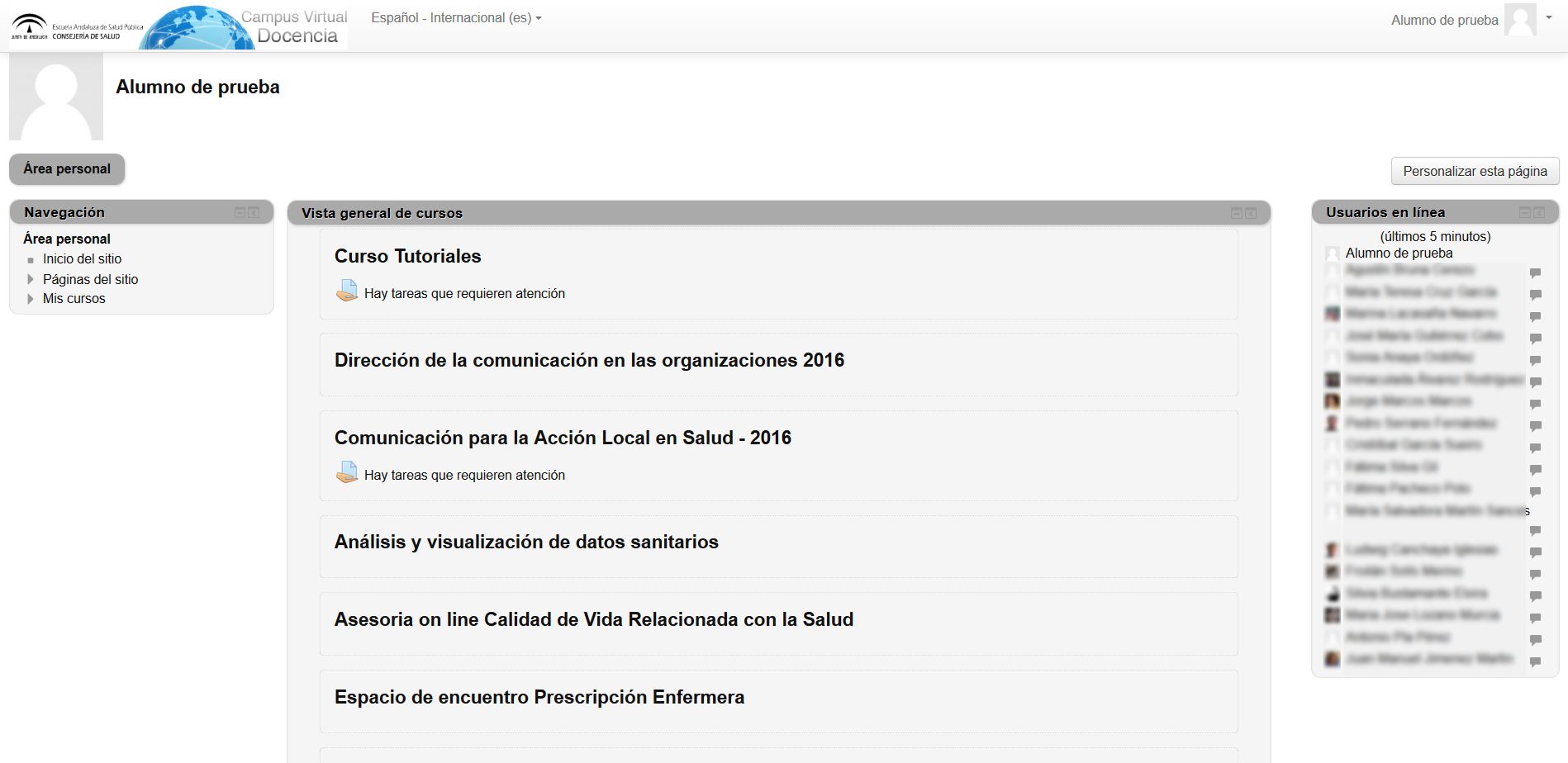 En la zona central vemos un bloque que nos muestra todos los cursos en los que estamos matriculados (con un enlace para entrar a ellos). En algún momento nos mostrará mensajes como "Hay tareas que requieren su atención". Esto quiere decir que la tarea está activa, en plazo, que se puede interactuar. No quiere decir necesariamente que no se haya entregado la tarea, simplemente que está "activa". Si hacemos click en el mensaje, nos facilita información detallada (entregado, no entregado, plazos...)
