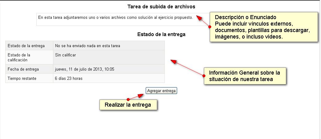 Como podemos comprobar, tenemos primero la descripción, lo que se nos pide que hagamos, después información general sobre plazos, etc. y por último el botón de "Agregar Entrega". Si no aparece el botón "Agregar Entrega" es posible que haya pasado la fecha límite para el envío y por eso no nos deja subirla. En ese caso, contacte con su tutor/a.