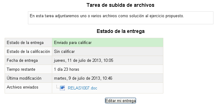 Y ya tenemos entregada la tarea. En la imagen puedes ver cómo aparece la fecha de entrega, información sobre la misma, y un botón "Editar mi entrega" para modificarla en caso que hayas enviado una errónea, o si posteriormente quieres enviar una nueva versión (siempre que aún no haya sido calificada y estés dentro de plazo).