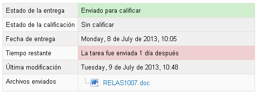 A veces se permite entregar una tarea fuera de plazo. En ese caso nos indicará en rojo la fecha de la entrega. Si no se permite el envío fuera de plazo y hemos sobrepasado la fecha límite, simplemente no aparecerá el botón para "Agregar envío"