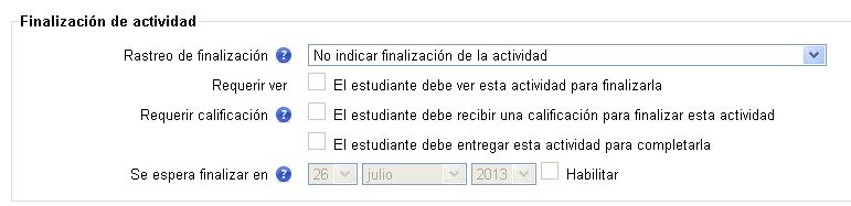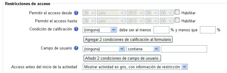 Este otro bloque también es común a todos los elementos del curso (EDC), e indica cuales son los criterios (si es que los hay) para que la actividad esté disponible. Cuando se cumplan los criterios estará a disposición de los participantes. Mientras tanto, estará oculta o en gris (dependiendo de lo que indiquemos en la última opción).