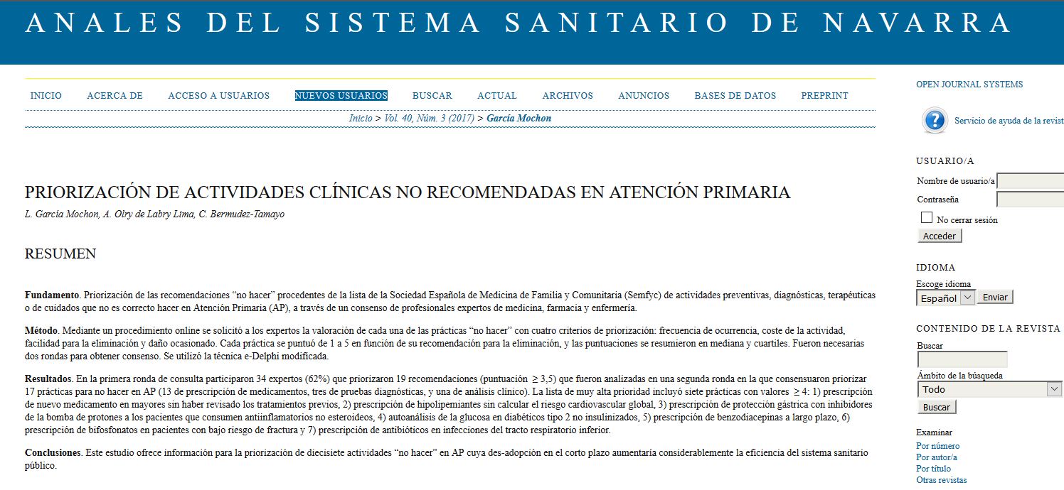 Conclusiones. Este estudio ofrece información para la priorización de diecisiete actividades “no hacer” en AP cuya des-adopción en el corto plazo aumentaría considerablemente la eficiencia del sistema sanitario público.