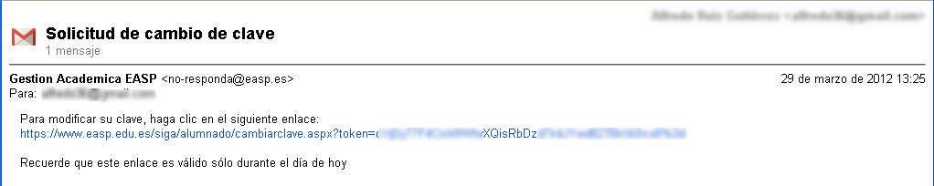 El email que recibirá es similar a este, y contendrá un enlace que le permitirá crear su nueva contraseña. Si al hacer click en el vínculo no se abre una ventana en el navegador, copie la url (la línea azul completa) y péguelo en la barra de direcciones de su navegador.