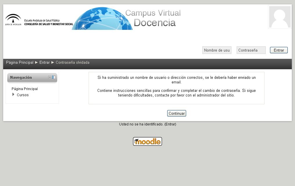 Cuando intente acceder al campus virtual con un usuario o contraseña erróneos, aparecerá el siguiente mensaje. Si no recuerda usuario y/o contraseña y quiere restablecerla, puede hacer click en "Entrar" sin poner esos datos y aparecerá el mismo mensaje.
