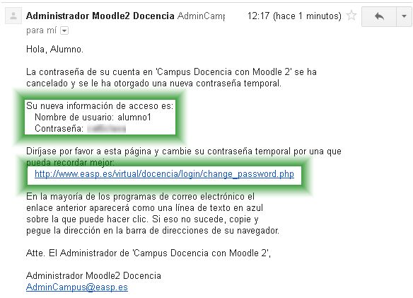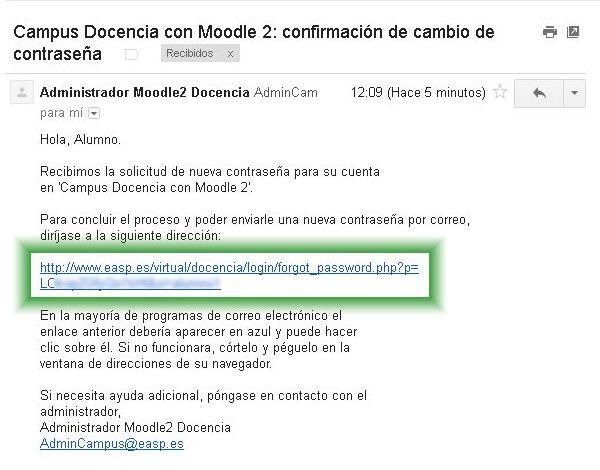 Recibirá un email de "Administrador Moodle2 Docencia" similar al que mostramos a continuación. El email contendrá un enlace que le