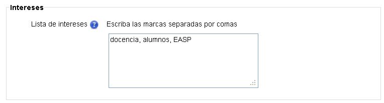 En este espacio puede escribir sus intereses como una lista, separados por comas. Esto los guardará como "marcas" y facilitará la búsqueda dentro del campus para, por ejemplo, encontrar participantes con intereses similares.