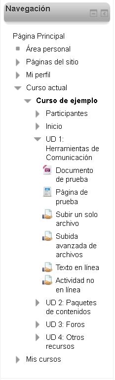 El primer bloque con el que debemos familiarizarnos, ya que nos permitirá (junto a la barra de navegación) movernos por el curso, es el bloque "Navegación".