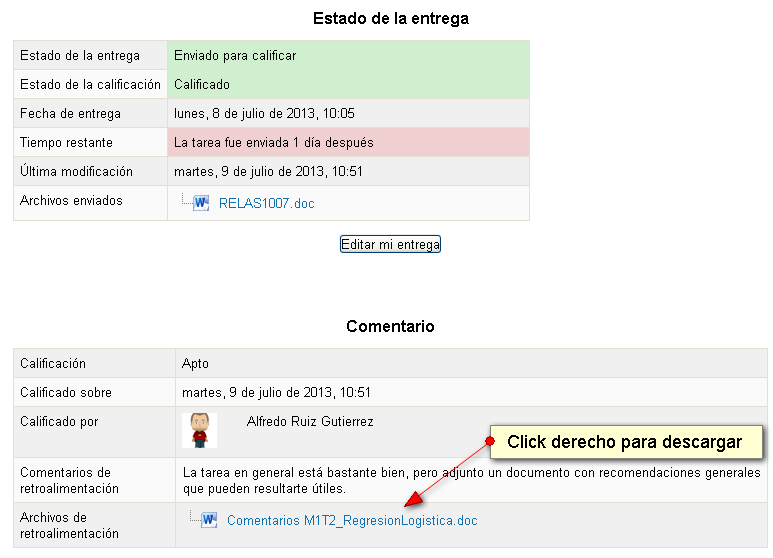 Ahora podemos ver nuestra calificación, los comentarios de retroalimentación, descargar el archivo de retroalimentación si lo hubiera, etc.