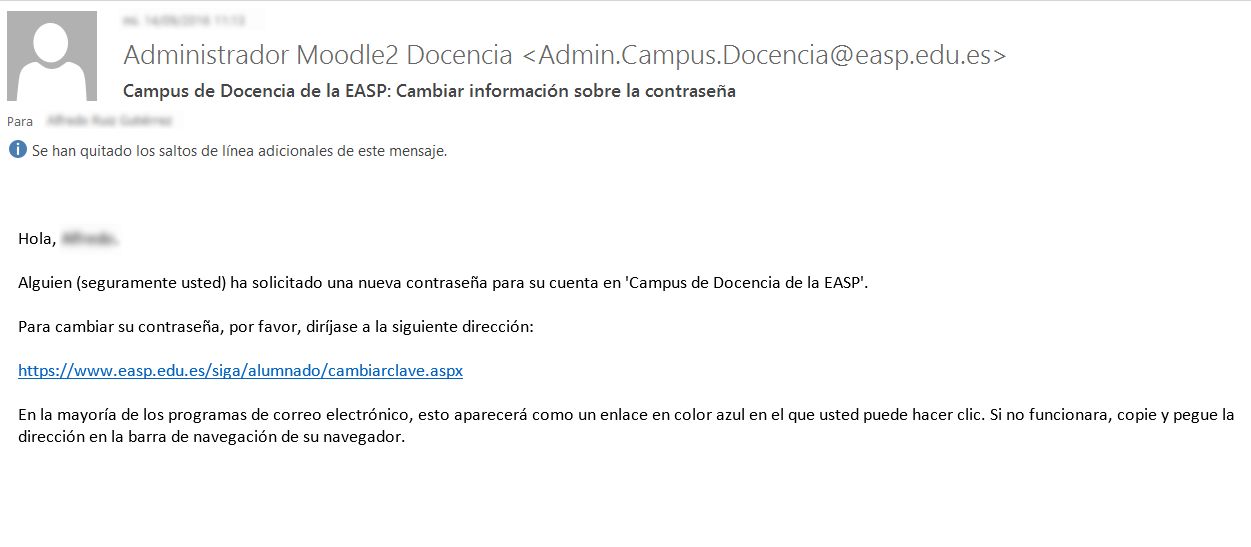 En breve recibirá un email de "Administrador Moodle2 Docencia" similar al que mostramos a continuación. El email contendrá un enlace que le permitirá restablecer su contraseña. Si al hacer click en el vínculo no se abre una ventana en el navegador, copie la url (la línea azul completa) y péguelo en la barra de direcciones de su navegador.