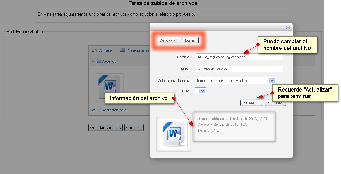 Aquí podemos subir más archivos, borrarlos, renombrarlos, descargarlos.... y "Guardar cambios" para finalizar.