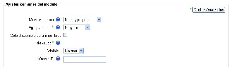 Estos ajustes son los que podemos encontrar en otras actividades y recursos de moodle, y se refieren a la configuración de grupos y agrupamientos (si los hubiera).