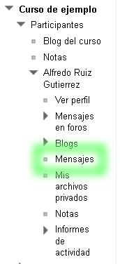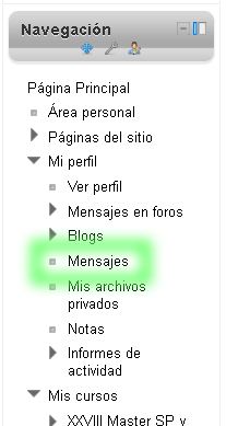 Podemos acceder a la sección de mensajes desde varios sitios dentro de la plataforma. Por ejemplo desde "Mi perfil" o dentro del curso, en el desplegable que aparece con nuestro nombre.
