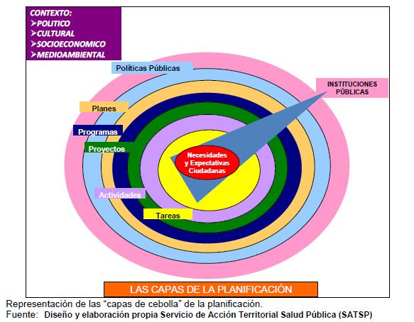 En los procesos de planificación suelen identificarse distintos niveles jerárquicos de intervención, a modo de capas de cebolla, que se contiene las unas a las otras manteniendo una coherencia entre objetivos de distintos niveles, lo que supone el abordaje integral de las intervenciones.