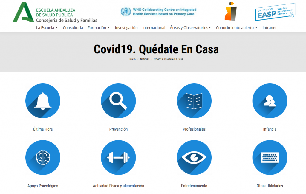 La Escuela Andaluza de Salud Pública ha creado un portal con recursos en relación a la pandemia del Coronavirus (https://www.easp.es/coronavirus-easp/). El portal nació como un centro de recursos para afrontar la cuarentena y se ha ido ampliando para dar respuesta a las necesidades de información, formación y acompañamiento tanto de profesionales como de la ciudadanía