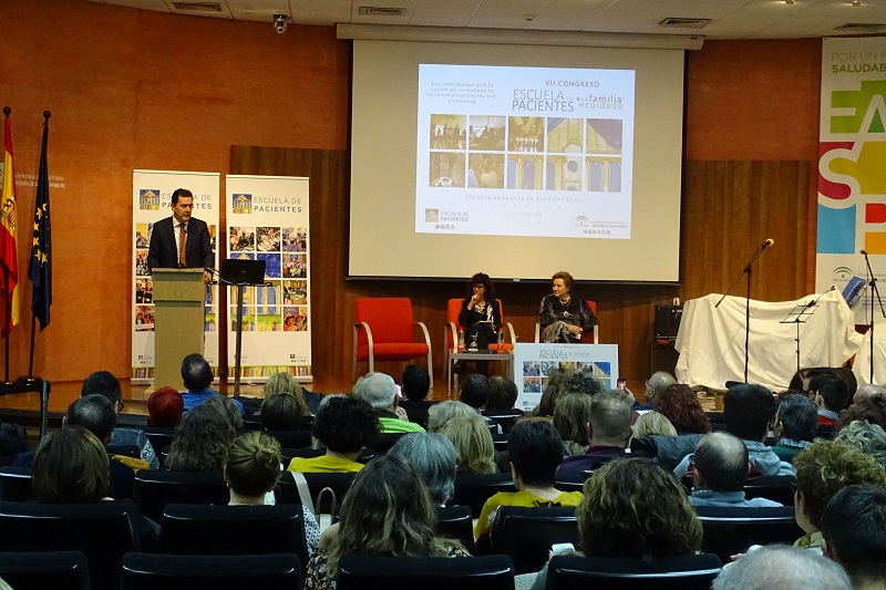 El director general de Cuidados Sociosanitarios de la Consejería de Salud y Familias, José Repiso junto a la directora gerente de la EASP, Blanca Fernández-Capel, y la directora del proyecto de Escuela de Pacientes, María Ángeles Prieto, han sido los encargados de dar la bienvenida a las más de 300 personas que se han reunido en esta séptima edición del Congreso de Pacientes, un encuentro de pacientes, familias y profesionales en torno al lema #UnaFamiliaDeCuidado, que convierte a la Escuela Andaluza de Salud Pública en un punto de reunión en el que intercambiar experiencias, conocimientos y estrategias para mejorar la salud y los cuidados.
