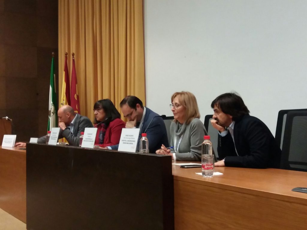 La directora del Plan Integral de Oncología de Andalucía, Eloísa Bayo se dirige a profesionales y pacientes en la Jornada de Cáncer de Pulmón no Microcítico. En la mesa están con ella el gerente del Hospital Universitario Virgen Macarena, Antonio Castro, la directora del Registro de Cáncer de Granada y profesora de la EASP, M José Sánchez y el oncólogo del Virgen Macarena, David Vicente Baz