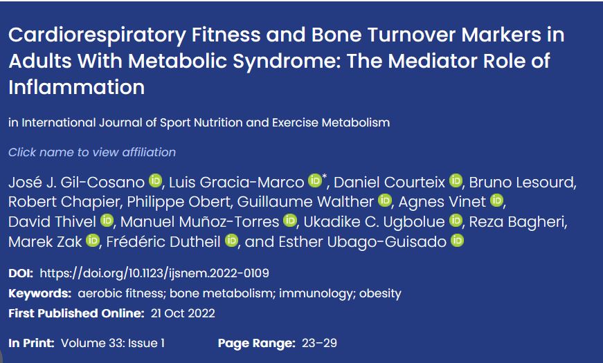 The relationship between inflammatory markers and bone turnover in adults is well known, and a negative association between cardiorespiratory fitness (CRF) and inflammatory markers has also been described. Hence, we tested whether the association between CRF and bone turnover markers is mediated by inflammatory markers in adults with metabolic syndrome. A total of 81 adults (58.5 ± 5.0 years, 62.7% women) were included in the analysis. CRF was measured by the 6-min walking test. Serum interleukin (IL)-1β, IL-6, IL-10, tumor necrosis factor alpha, high-sensitivity c-reactive protein (hsCRP) and vascular endothelial growth factor, collagen type I cross-linked C-telopeptide, procollagen type I N-terminal propeptide (P1NP), and total osteocalcin were assessed using a sensitive ELISA kit. Body composition was assessed by dual-energy X-ray absorptiometry. Partial correlation was used to test the relationship between CRF, inflammatory markers, and bone turnover markers, controlling for sex, lean mass, and fat mass. Boot-strapped mediation procedures were performed, and indirect effects with confidence intervals not including zero were interpreted as statistically significant. CRF was positively correlated with P1NP levels (r = .228, p = .044) and osteocalcin levels (r = .296, p = .009). Furthermore, CRF was positively correlated with IL-1β levels (r = .340, p = .002) and negatively correlated with hsCRP levels (r = −.335, p = .003), whereas IL-1β levels were positively correlated with P1NP levels (r = .245, p = .030), and hsCRP levels were negatively correlated with P1NP levels (r = −.319, p = .004). Finally, the association between CRF and P1NP levels was totally mediated by hsCRP (percentage of mediation = 39.9). Therefore, CRF benefits on bone formation could be dependent on hsCRP concentrations in this population.