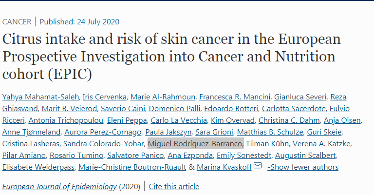 Citrus intake has been suggested to increase the risk of skin cancer. Although this relation is highly plausible biologically, epidemiologic evidence is lacking. We aimed to examine the potential association between citrus intake and skin cancer risk. EPIC is an ongoing multi-center prospective cohort initiated in 1992 and involving ~ 520,000 participants who have been followed-up in 23 centers from 10 European countries. Dietary data were collected at baseline using validated country-specific dietary questionnaires. We used Cox proportional hazards regression models to compute hazard ratios (HR) and 95% confidence intervals (CI). During a mean follow-up of 13.7 years, 8448 skin cancer cases were identified among 270,112 participants. We observed a positive linear dose–response relationship between total citrus intake and skin cancer risk (HR = 1.10, 95% CI 1.03–1.18 in the highest vs. lowest quartile; Ptrend = 0.001), particularly with basal cell carcinoma (BCC) (HR = 1.11, 95% CI 1.02–1.20, Ptrend = 0.007) and squamous cell carcinoma (SCC) (HR = 1.23, 95% CI 1.04–1.47, Ptrend = 0.01). Citrus fruit intake was positively associated with skin cancer risk (HR = 1.08, 95% CI 1.01–1.16, Ptrend = 0.01), particularly with melanoma (HR = 1.23, 95% CI 1.02–1.48; Ptrend = 0.01), although with no heterogeneity across skin cancer types (Phomogeneity = 0.21). Citrus juice was positively associated with skin cancer risk (Ptrend = 0.004), particularly with BCC (Ptrend = 0.008) and SCC (Ptrend = 0.004), but not with melanoma (Phomogeneity = 0.02). Our study suggests moderate positive linear dose–response relationships between citrus intake and skin cancer risk. Studies with available biomarker data and the ability to examine sun exposure behaviors are warranted to clarify these associations and examine the phototoxicity mechanisms of furocoumarin-rich foods.