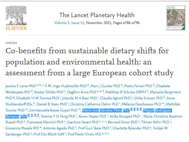 Using data from 443 991 participants in the European Prospective Investigation into Cancer and Nutrition (EPIC) study, a multicentre prospective cohort, we estimated associations between dietary contributions to greenhouse gas emissions and land use and all-cause and cause-specific mortality and incident cancers using Cox proportional hazards regression models. The main exposures were modelled as quartiles. Co-benefits, encompassing the potential effects of alternative diets on all-cause mortality and cancer and potential reductions in greenhouse gas emissions and land use, were estimated with counterfactual attributable fraction intervention models, simulating potential effects of dietary shifts based on the EAT–Lancet reference diet.