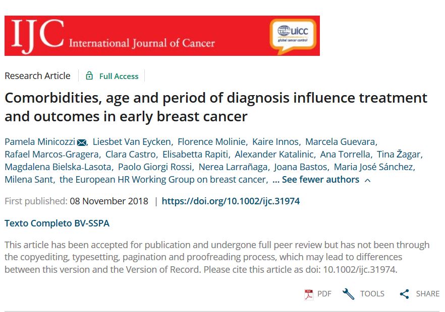 We analysed 7,581 stage I/IIA cases diagnosed in 9 European countries in 2009−13, and 4 STs: surgery; breast‐conserving surgery plus radiotherapy (BCS+RT); reconstruction after mastectomy; and prompt treatment (≤6 weeks after diagnosis). Covariate‐adjusted models estimated odds of receiving STs and risks of death/relapse, according to comorbidities. Pearson’s R assessed correlations between odds and risks. The z‐test assessed the significance of time‐trends.