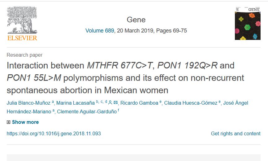 MTHFR is a key enzyme in folate metabolism. Some genetic polymorphisms code for a less efficient enzyme, increasing serum concentrations of homocysteine. This has been associated with inadequate feto-maternal circulation and increased risk of spontaneous abortion. Paroxonase 1 (PON1) is a multifunctional enzyme that can detoxify homocysteine through its homocysteine thiolactonase activity. We evaluate the association between MTHFR 677 C>T polymorphisms and non-recurrent spontaneous abortion and its interaction with PON1 polymorphisms involved in homocysteine metabolism in women living in floricultural areas in Mexico. Sociodemographic, reproductive history, folic acid consumption during pregnancy and environmental exposure data of 264 women who had been pregnant sometime during the 10 years prior to study enrolment were collected. MTHFR 677 C>T, PON1 192Q>R and PON1 55L>M genotypes were determined by PCR amplification. Information on pregnancy outcome and maternal genotypes was obtained for 484 pregnancies: 34 non-recurrent spontaneous abortions (gestational age < 20 weeks) and 450 controls. GEE models were used to evaluate the association between MTHFR polymorphism and non-recurrent spontaneous abortion, and its interaction with PON1 polymorphisms.