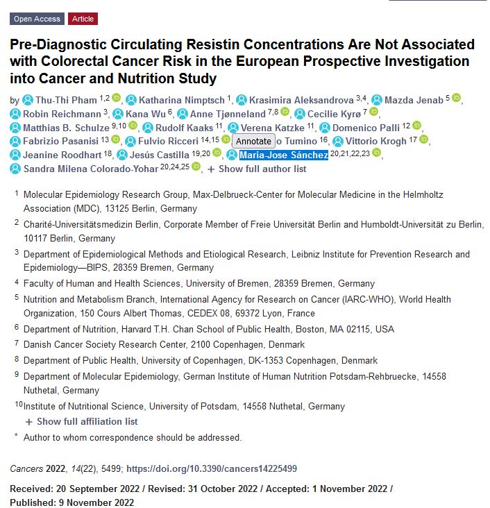 Resistin is a polypeptide implicated in inflammatory processes, and as such could be linked to colorectal carcinogenesis. In case-control studies, higher resistin levels have been found in colorectal cancer (CRC) patients compared to healthy individuals. However, evidence for the association between pre-diagnostic resistin and CRC risk is scarce. We investigated pre-diagnostic resistin concentrations and CRC risk within the European Prospective Investigation into Cancer and Nutrition using a nested case-control study among 1293 incident CRC-diagnosed cases and 1293 incidence density-matched controls. Conditional logistic regression models controlled for matching factors (age, sex, study center, fasting status, and women-related factors in women) and potential confounders (education, dietary and lifestyle factors, body mass index (BMI), BMI-adjusted waist circumference residuals) were used to estimate relative risks (RRs) and 95% confidence intervals (CIs) for CRC. Higher circulating resistin concentrations were not associated with CRC (RR per doubling resistin, 1.11; 95% CI 0.94–1.30; p = 0.22). There were also no associations with CRC subgroups defined by tumor subsite or sex. However, resistin was marginally associated with a higher CRC risk among participants followed-up maximally two years, but not among those followed-up after more than two years. We observed no substantial correlation between baseline circulating resistin concentrations and adiposity measures (BMI, waist circumference), adipokines (adiponectin, leptin), or metabolic and inflammatory biomarkers (C-reactive protein, C-peptide, high-density lipoprotein cholesterol, reactive oxygen metabolites) among controls. In this large-scale prospective cohort, there was little evidence of an association between baseline circulating resistin concentrations and CRC risk in European men and women.