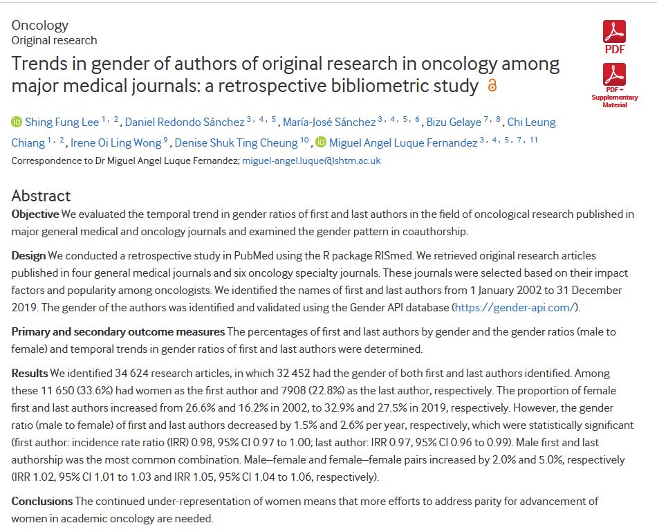 Design We conducted a retrospective study in PubMed using the R package RISmed. We retrieved original research articles published in four general medical journals and six oncology specialty journals. These journals were selected based on their impact factors and popularity among oncologists. We identified the names of first and last authors from 1 January 2002 to 31 December 2019. The gender of the authors was identified and validated using the Gender API database (https://gender-api.com/).