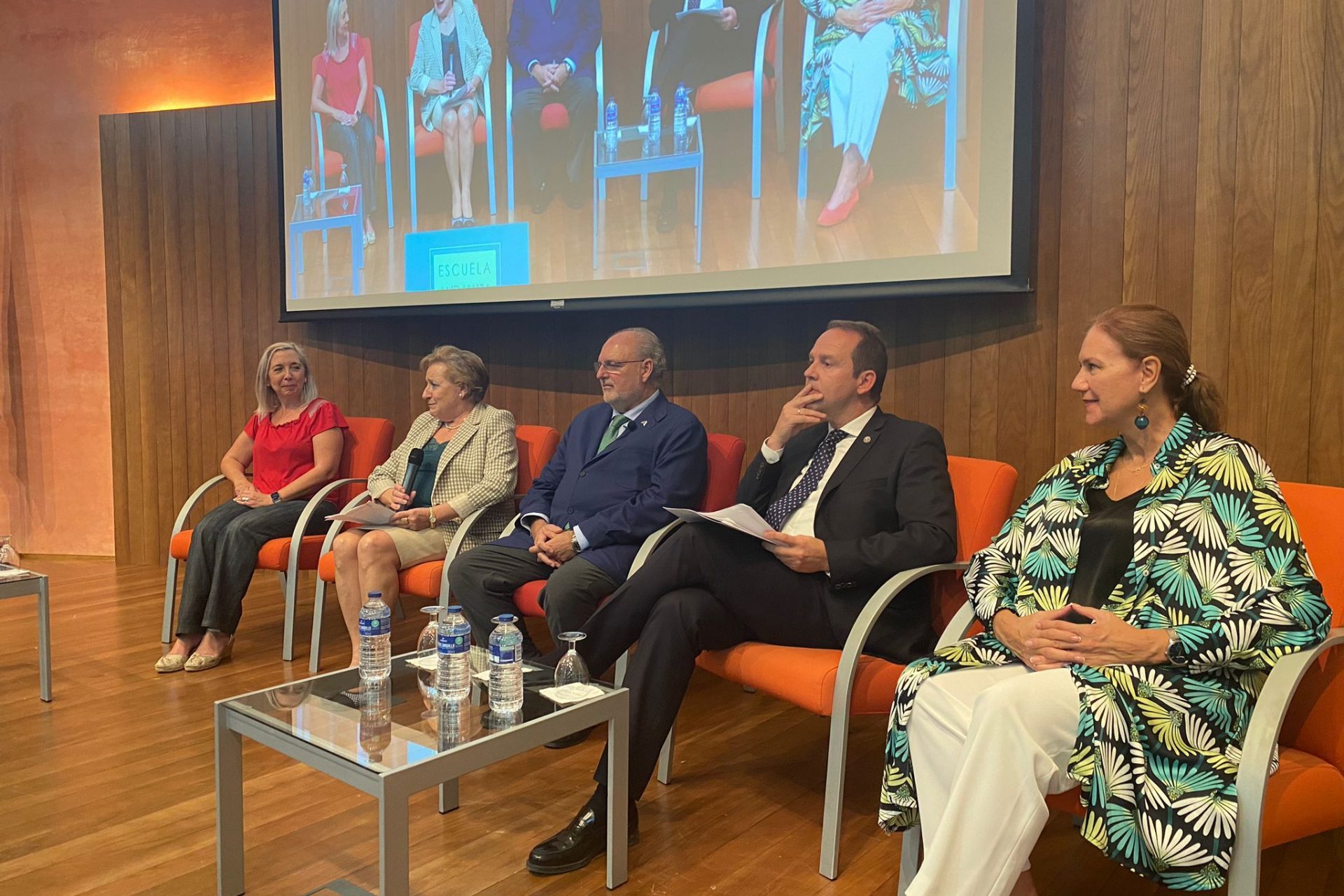 De izquierda a derecha, la directora general de Humanización, Planificación, Coordinación y Cuidados del SAS, Inmaculada Vázquez; la directora gerente de la EASP, Blanca Fernández-Capel; el viceconsejero de Salud y Consumo, Miguel Ángel Guzmán; el rector de la Universidad Internacional de Andalucía UNIA, José Ignacio García y la la directora general de Personal del SAS, Carmen Bustamante, durante la bienvenida al alumnado del Diploma de Directivos.