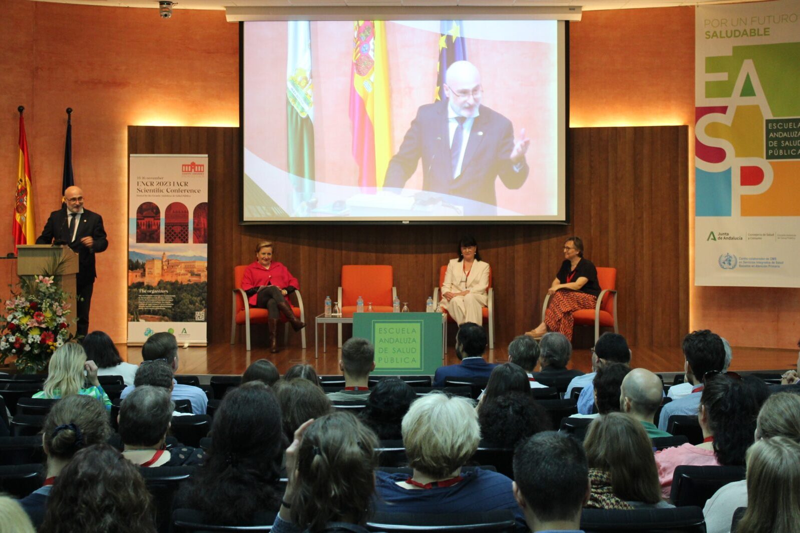 El secretario general de Salud Pública e I+D+i, Isaac Túnez ha presidido la sesión de bienvenida acompañado por la presidenta de la IACR, Joanne Aitken, la representante de IACR en la ENCR, Liesbet Van Eycken, y la directora gerente de la EASP, Blanca Fernández-Capel.