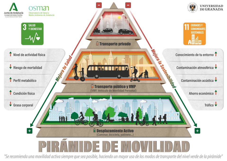 La pirámide de movilidad presenta de forma gráfica y jerarquizada las formas de desplazamiento según su aporte a la salud y la sostenibilidad. La pirámide de movilidad, creada de forma conjunta por la Consejería de Salud y Familias y la Universidad de Granada, representa qué formas de desplazarse deberían priorizarse para obtener impactos positivos tanto…