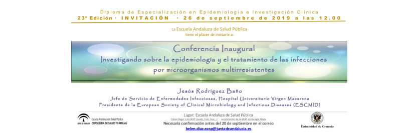 CONFERENCIA INAUGURAL «Investigando sobre la epidemiología y el tratamiento de las infecciones por microorganismos multirresistentes» D. Jesús Rodríguez Baño El Diploma de Especialización en Epidemiología e Investigación Clínica (23 edición), tiene el placer de invitarle a esta interesante conferencia: LUGAR Escuela Andaluza de Salud Pública. 26 de septiembre a las 12:00 horas …