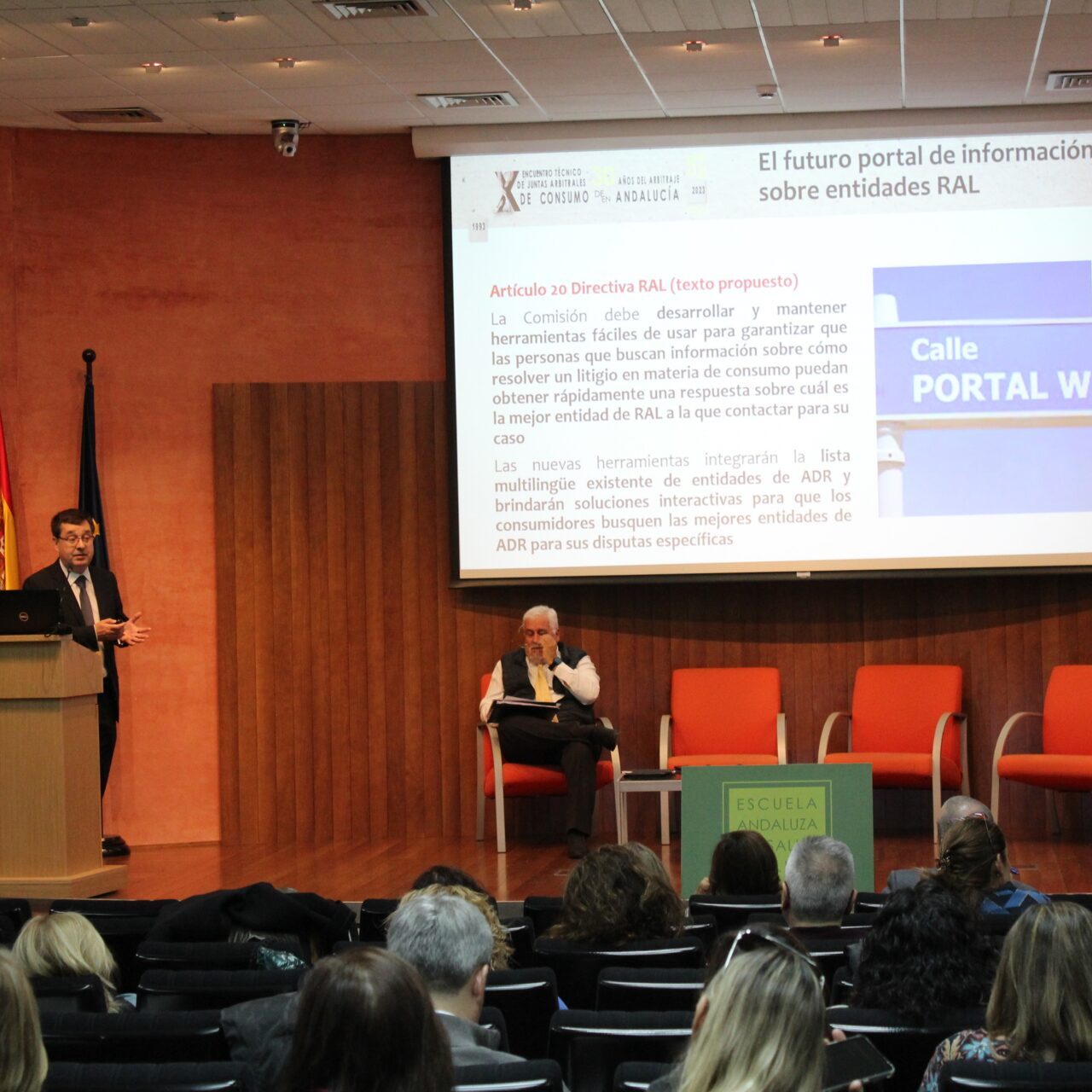 A través de ponencias y mesas redondas, se han tratado, por ejemplo, las posibilidades de la ‘Digitalización e integración de sistemas de inteligencia artificial en la resolución alternativa de litigios de consumo’, que fue el título de la ponencia inaugural, de Fernando Esteban de la Rosa, catedrático de Derecho Internacional Privado y director de la Unidad de Excelencia de Investigación Sociedad Digital: Seguridad y Protección de Derechos (Universidad de Granada).