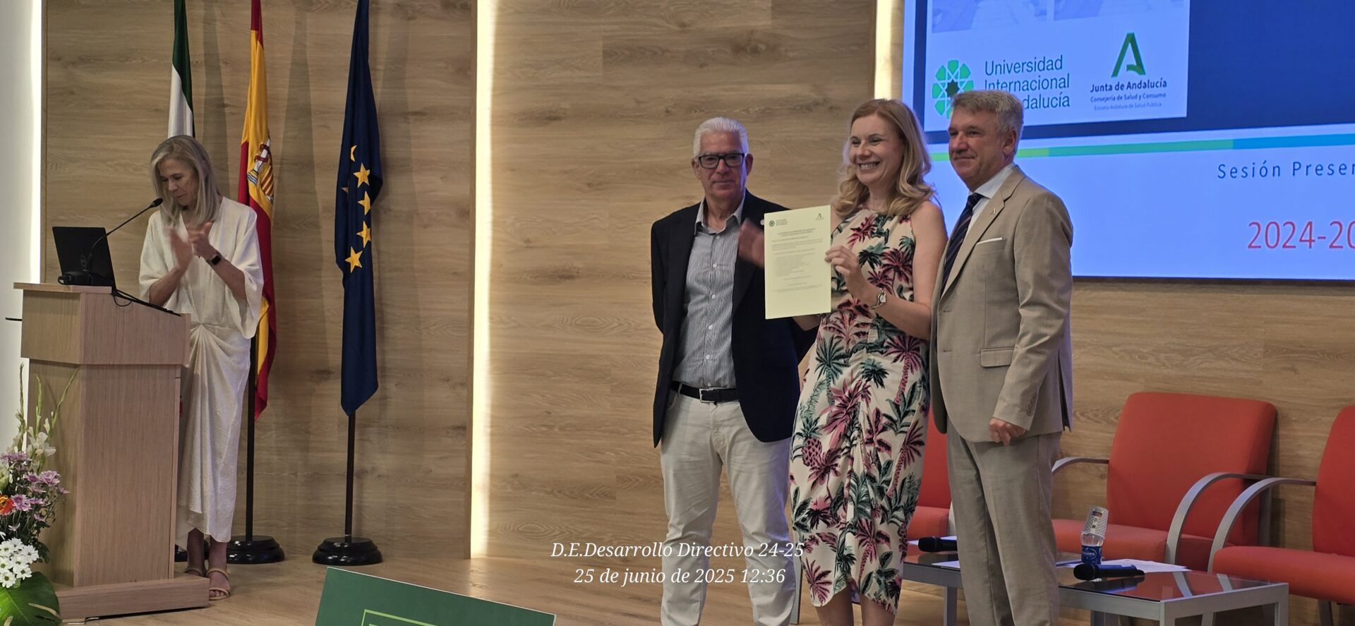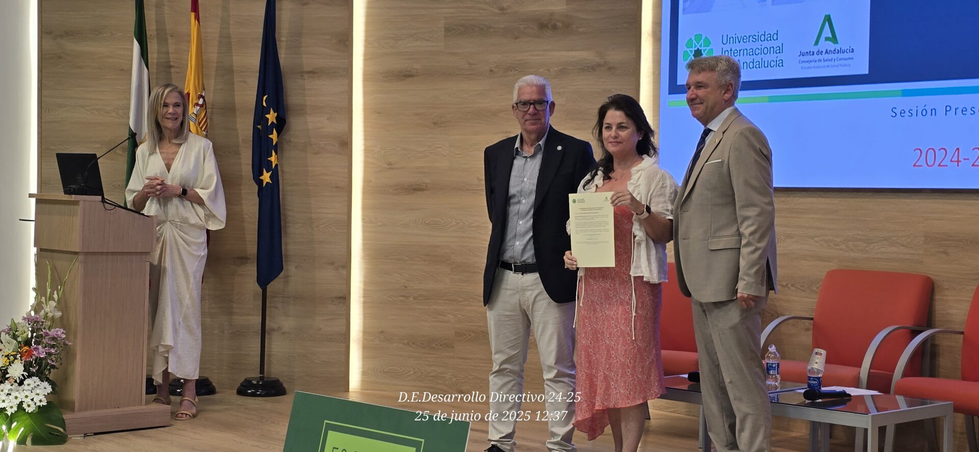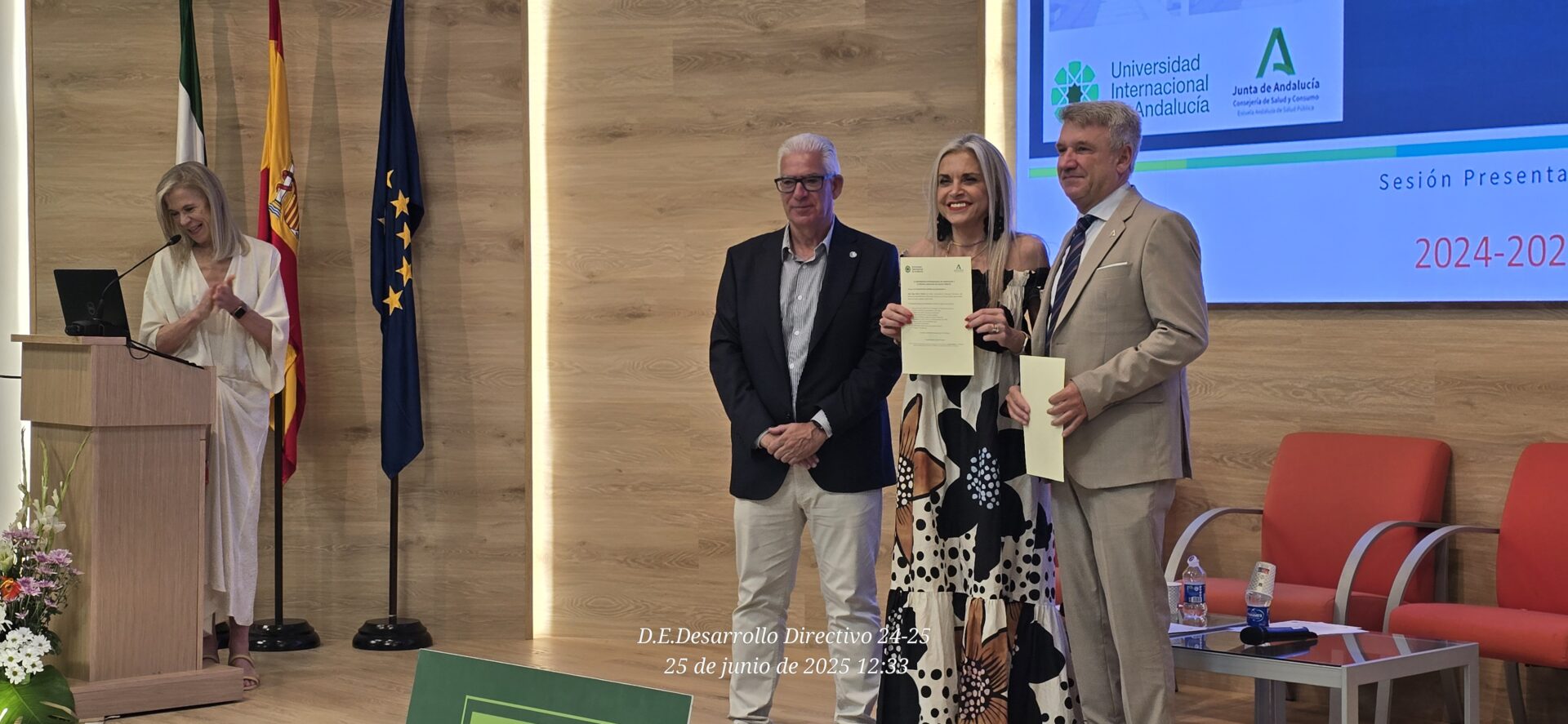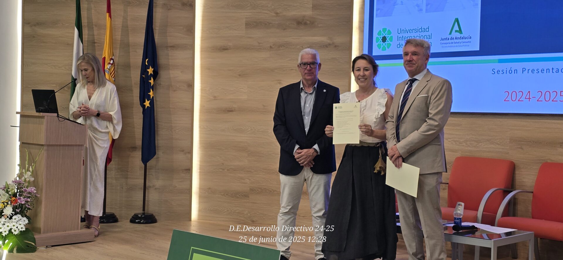 La consejera de Salud y Consumo, Rocío Hernández, ha mandado unas palabras de felicitación quienes reciben hoy su diploma, destacando que “desde la Consejería de Salud y Consumo se creemos firmemente que contar con equipos directivos bien formados es esencial para afrontar los desafíos de un sistema público que quiere seguir siendo referente, accesible y de calidad para toda la ciudadanía andaluza”. “Este diploma de especialización es fundamental para contar con directivos capaces de liderar con visión, rigor y humanidad”, ha añadido. La consejera se ha despedido agradeciendo a las instituciones que desarrollan el Diploma, al equipo docente y al Servicio Andaluz de Salud su compromiso e implicación desde el inicio del programa