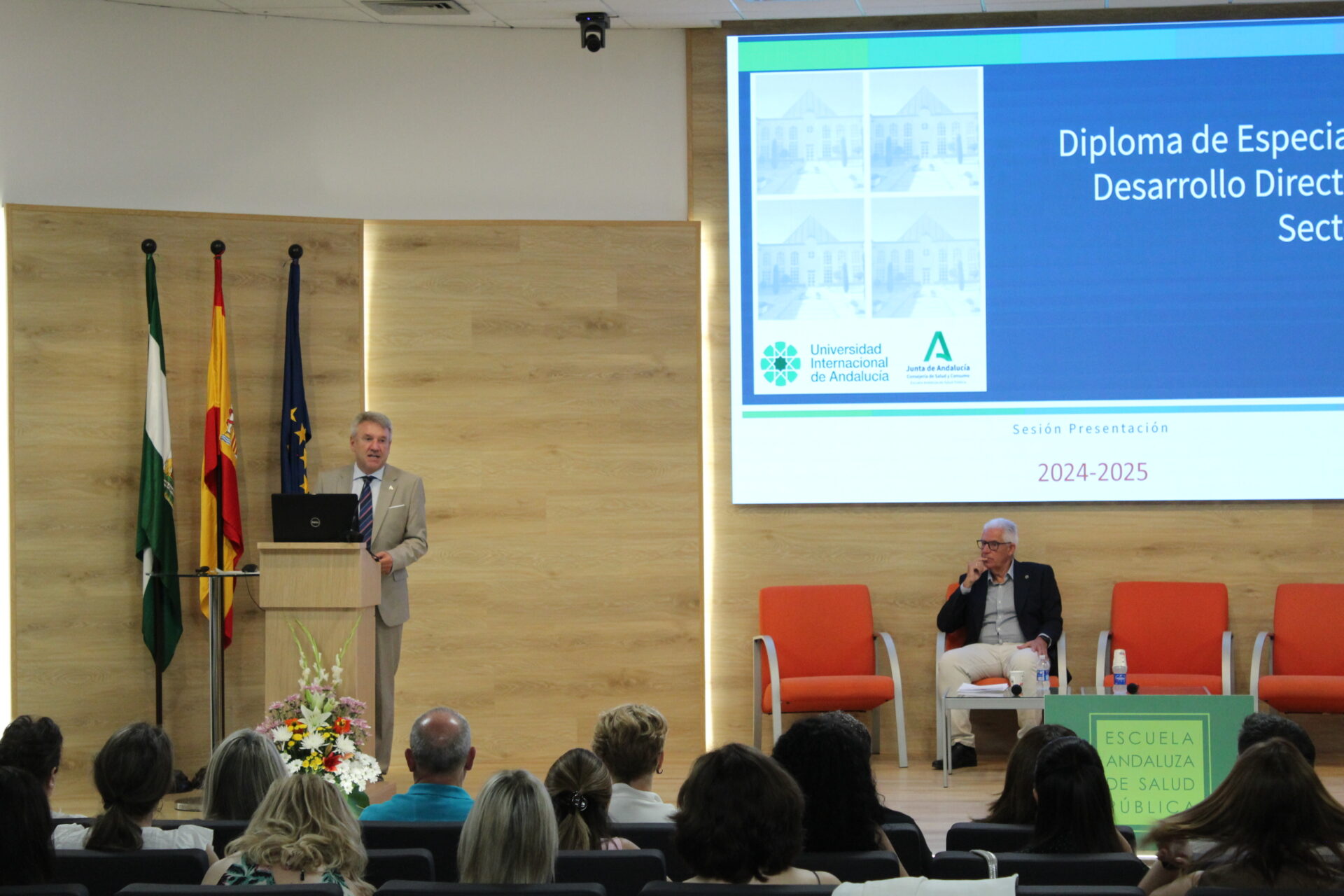 El director gerente de la Escuela Andaluza de Salud Pública (EASP), Diego Vargas, y el vicerrector de Empleabilidad y redes internacionales de la Universidad Internacional de Andalucía (UNIA), José Antonio Naranjo, han hecho entrega de los títulos de Diploma de Especialización en Desarrollo Directivo en el Sector Salud, a las 33 personas que finalizan esta edición de una formación de posgrado que se consolida como herramienta estratégica para el fortalecimiento del liderazgo sanitario en nuestra comunidad autónoma.