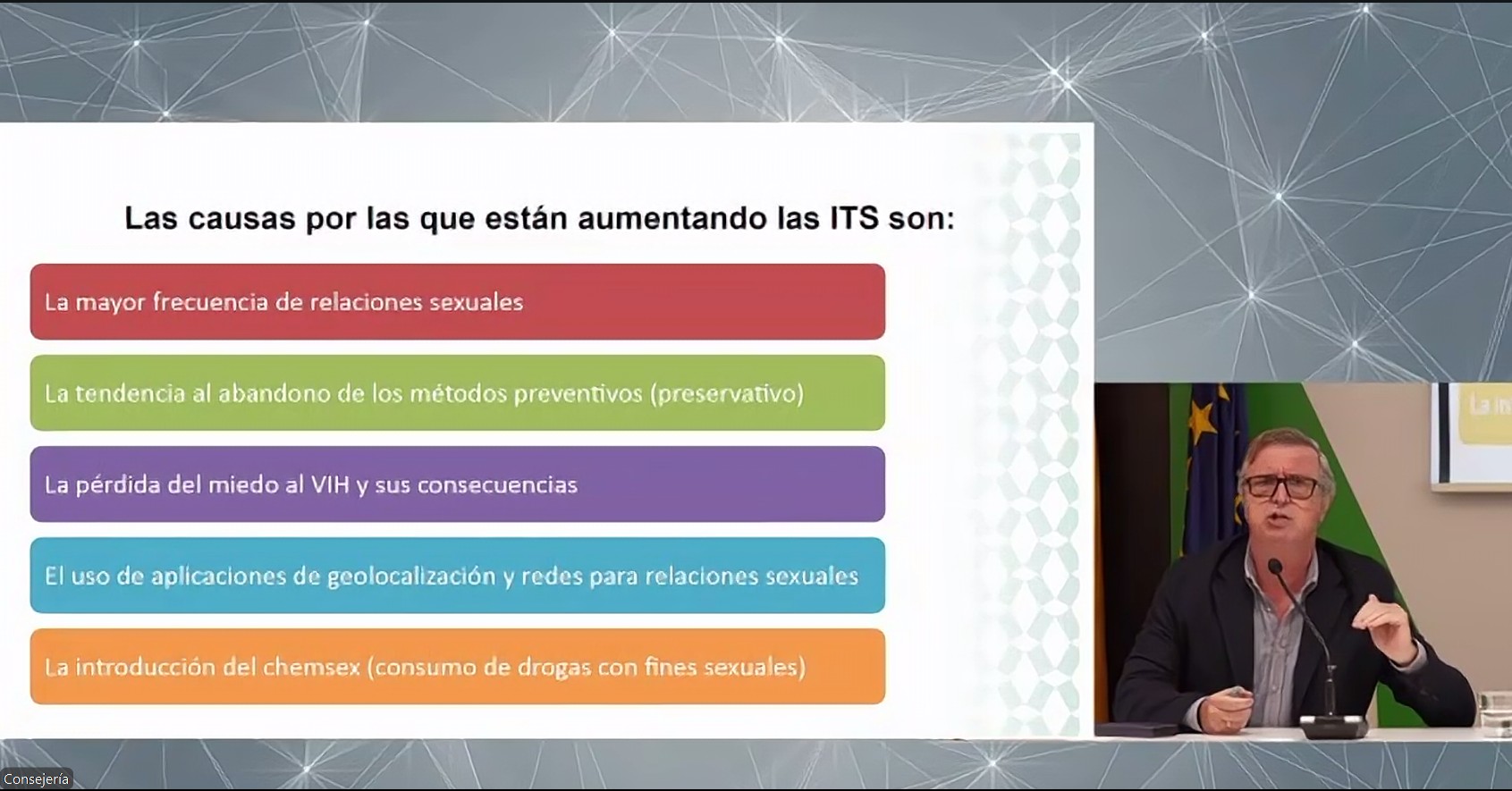 La jefa de Servicio de Vigilancia Epidemiológica y Salud Laboral, Ana Roldán, ha presentado un análisis de la evolución epidemiológica de las ITS entre 2013 y 2024, destacando las tendencias y los factores que explican su incremento. Por su parte, el director del Plan Andaluz de ITS, VIH y Sida (PAITSIDA), Javier de la Torre, ha expuesto las principales líneas de actuación del plan, centradas en reforzar la prevención, mejorar la atención y dar respuesta al aumento de los casos mediante estrategias coordinadas entre los distintos niveles asistenciales y comunitarios.