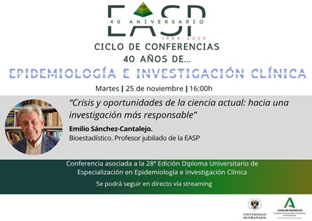 #40EASP40 años de Epidemiología e Investigación Clínica. «Crisis y oportunidades de la ciencia actual: hacia una investigación más responsable». Emilio Sánchez-Cantalejo. Bioestadístico. Profesor jubilado de la EASP. 25 de noviembre a las 16:00 h – VIRTUAL –   Conferencia en el marco del Diploma Universitario de Especialización en Epidemiología e Investigación Clínica El Diploma es…