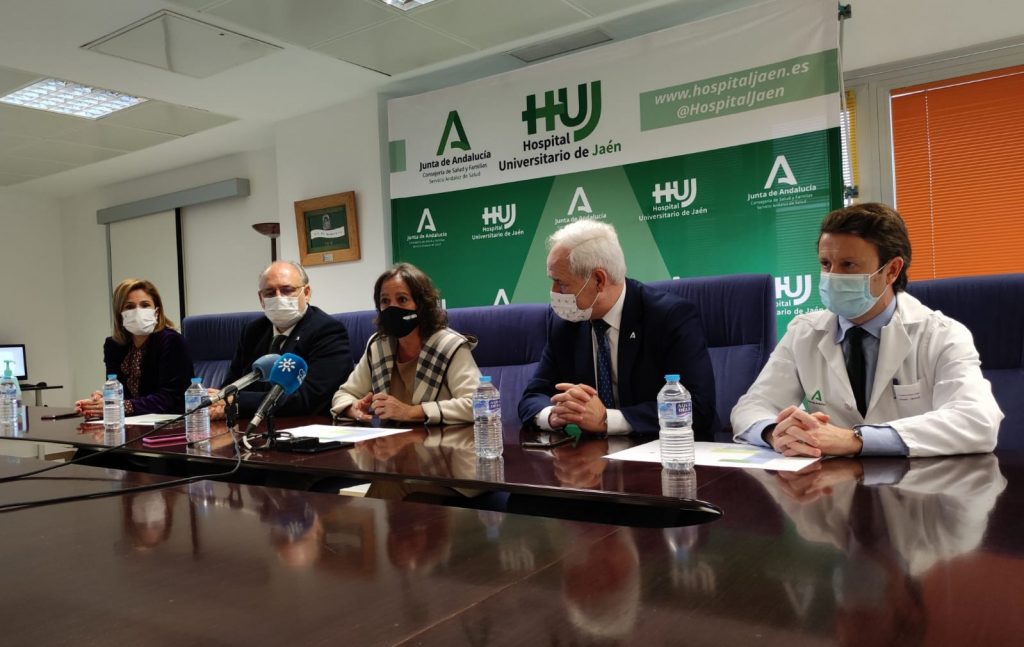 La viceconsejera de Salud y Familias, Catalina García, junto al director gerente del SAS, Miguel Ángel Guzman; el director general de Gestión Económica y Servicios, José Antonio Miranda; el director general de Asistencia Sanitaria, Diego Vargas; la delegada territorial de Salud y Familias en la provincia de Jaén, Trinidad Rus, y el director gerente del Hospital Universitario de Jaén, Javier La Rosa