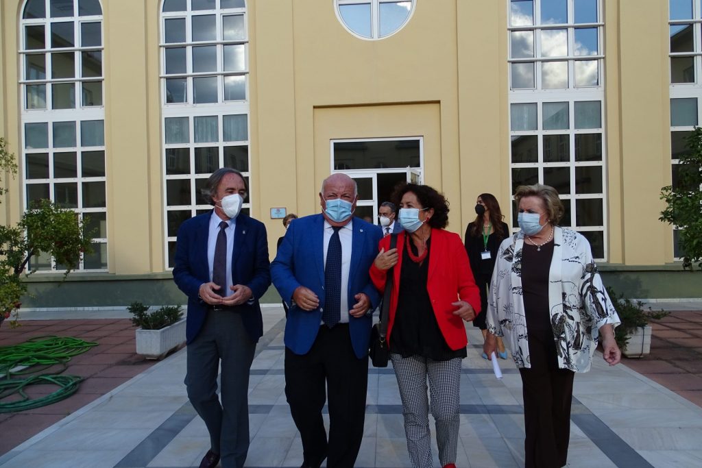 El delegado de Salud y Familias en Granada, junto al Consejero, la rectora de UGR y la directora gerente EASP cruzando el patio de la EASP.