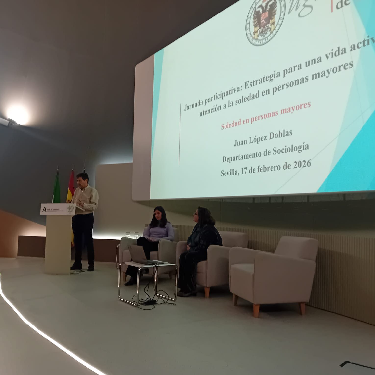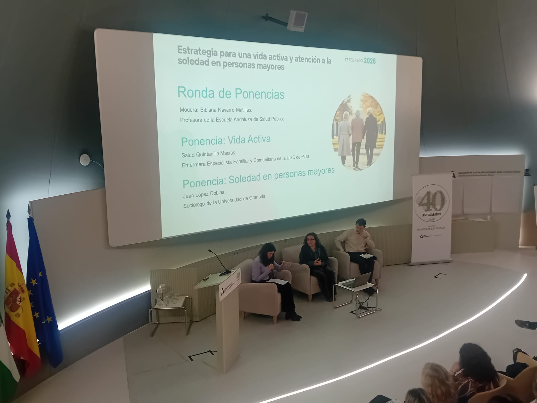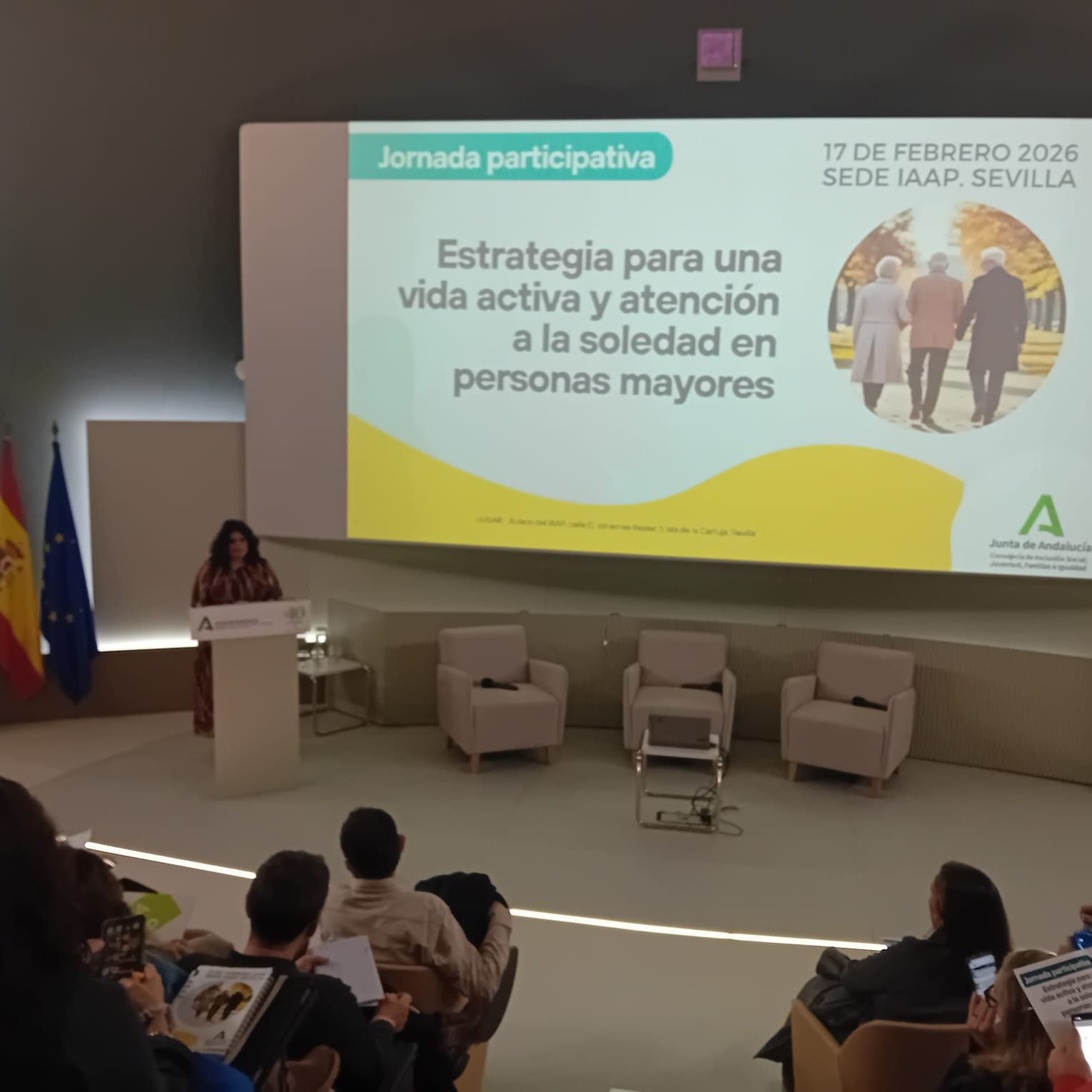La sede del Instituto Andaluz de Administración Pública (IAAP), en la Isla de la Cartuja de Sevilla, acoge hoy la Jornada participativa “Estrategia para una vida activa y atención a la soledad en personas mayores”, un encuentro promovido por la Consejería de Inclusión Social, Juventud, Familias e Igualdad que congrega a profesionales del ámbito social, sanitario y comunitario con el objetivo de compartir conocimiento y avanzar en líneas de actuación conjuntas.