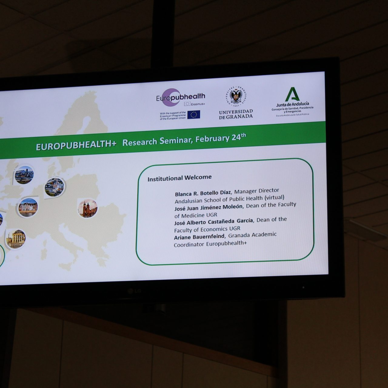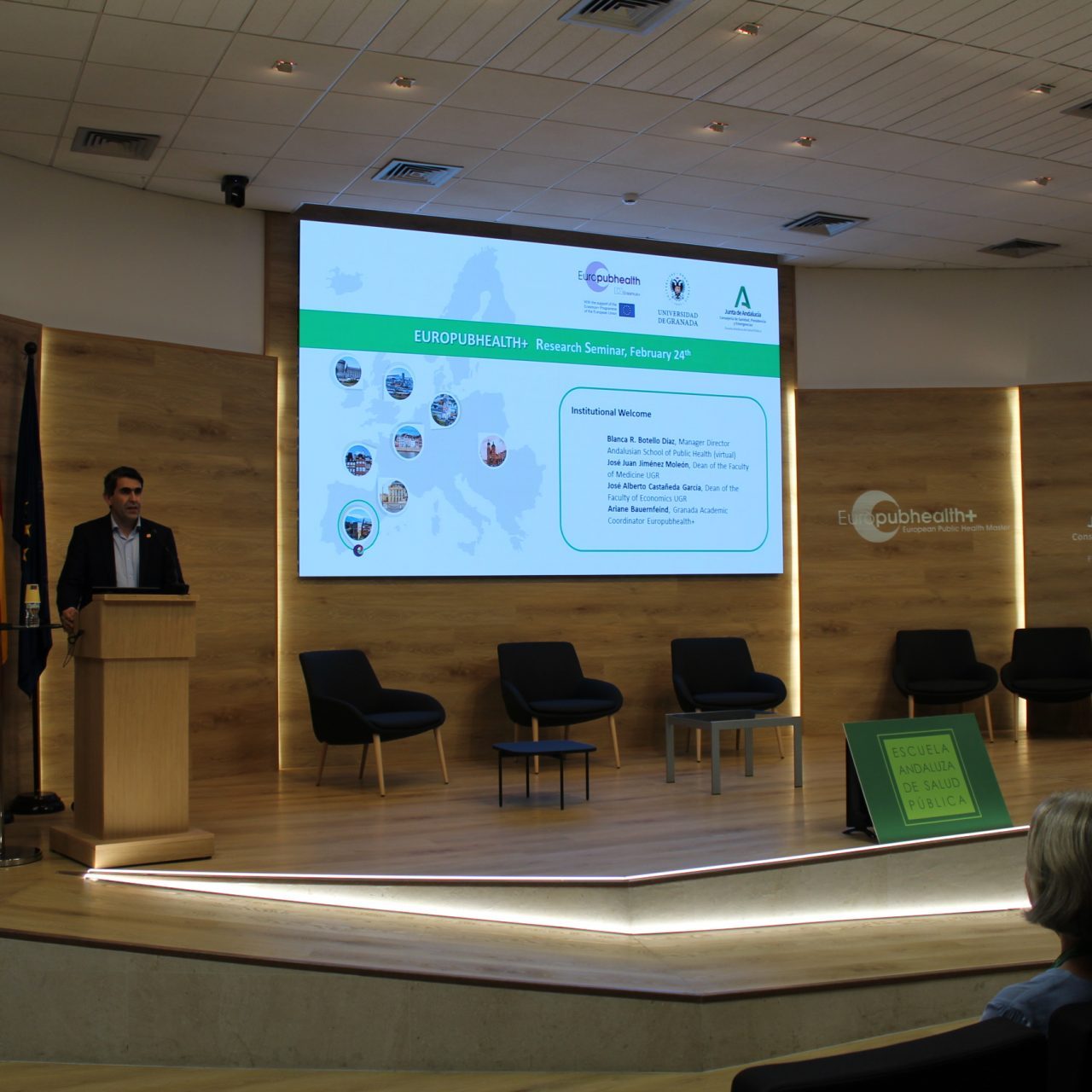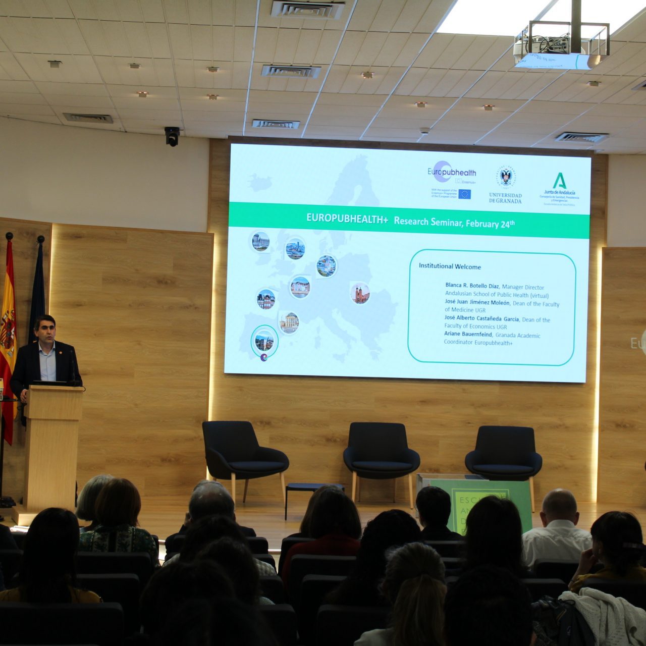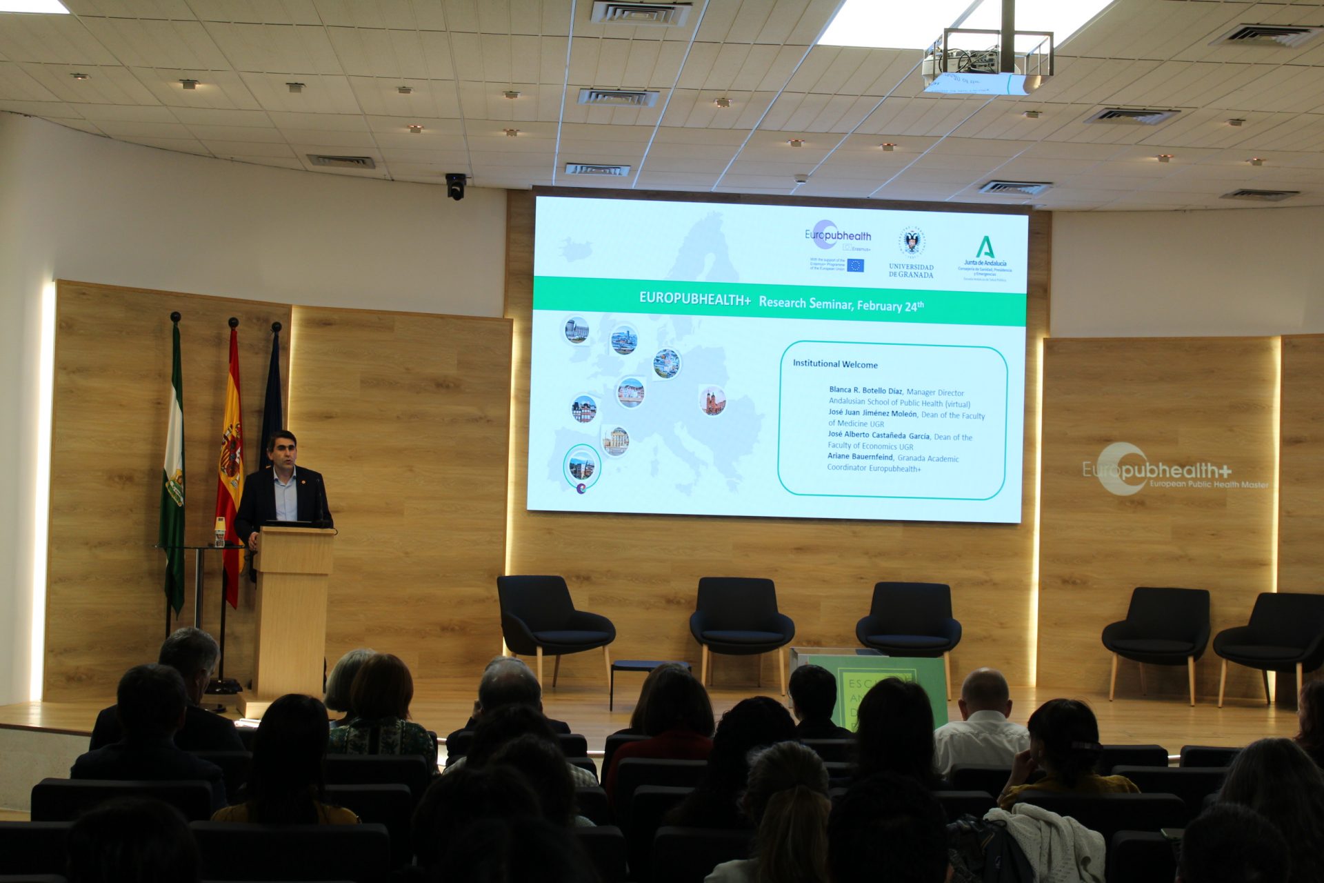 La sesión central ha comenzado con la bienvenida institucional, en la que han participado la directora gerente de la Escuela Andaluza de Salud Pública, Blanca R. Botello; el decano de la Facultad de Ciencias Económicas y Empresariales de la Universidad de Granada, José Alberto Castañeda García, y la coordinadora académica de Europubhealth+ en Granada, Ariane Bauernfeind.