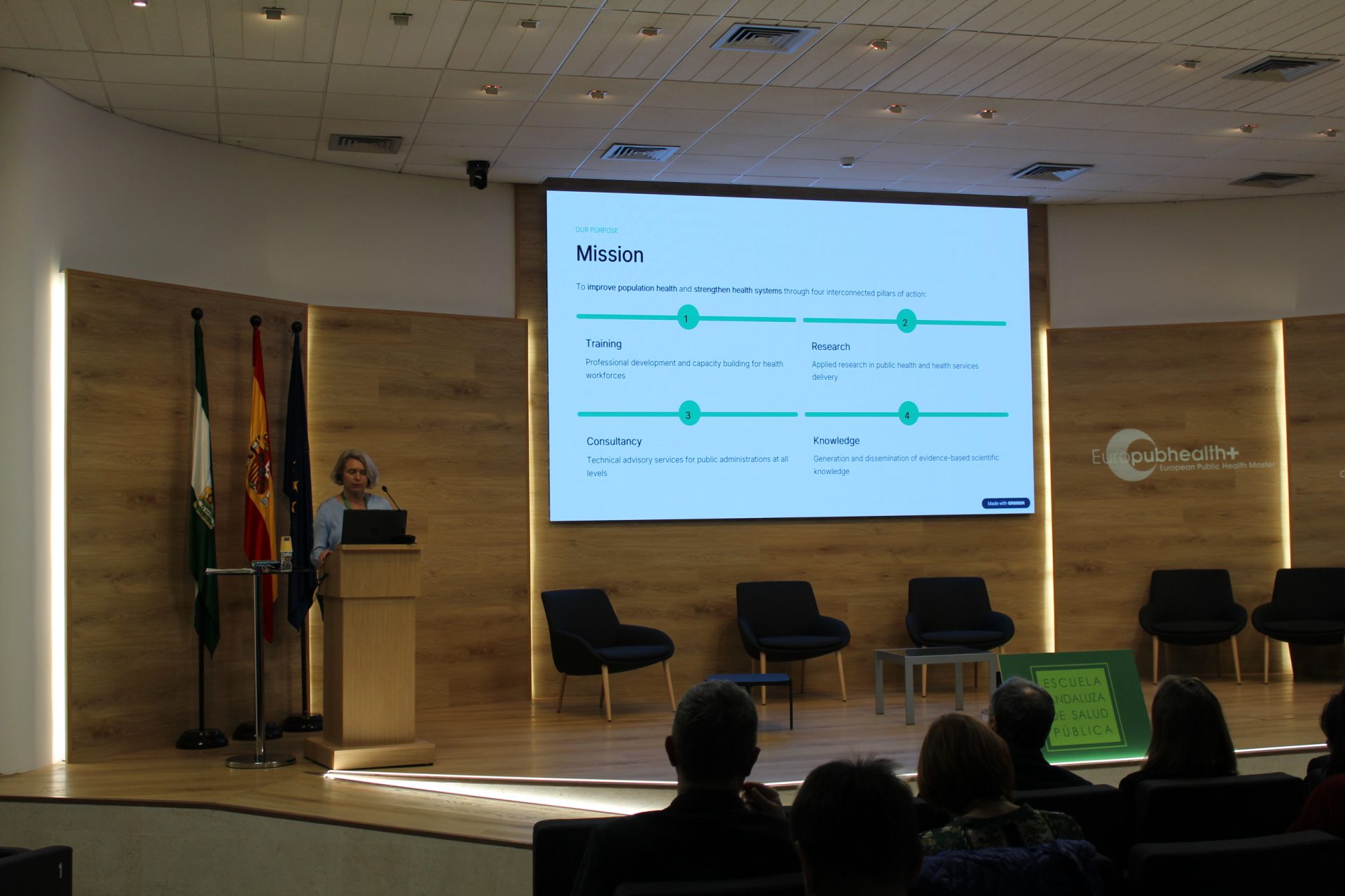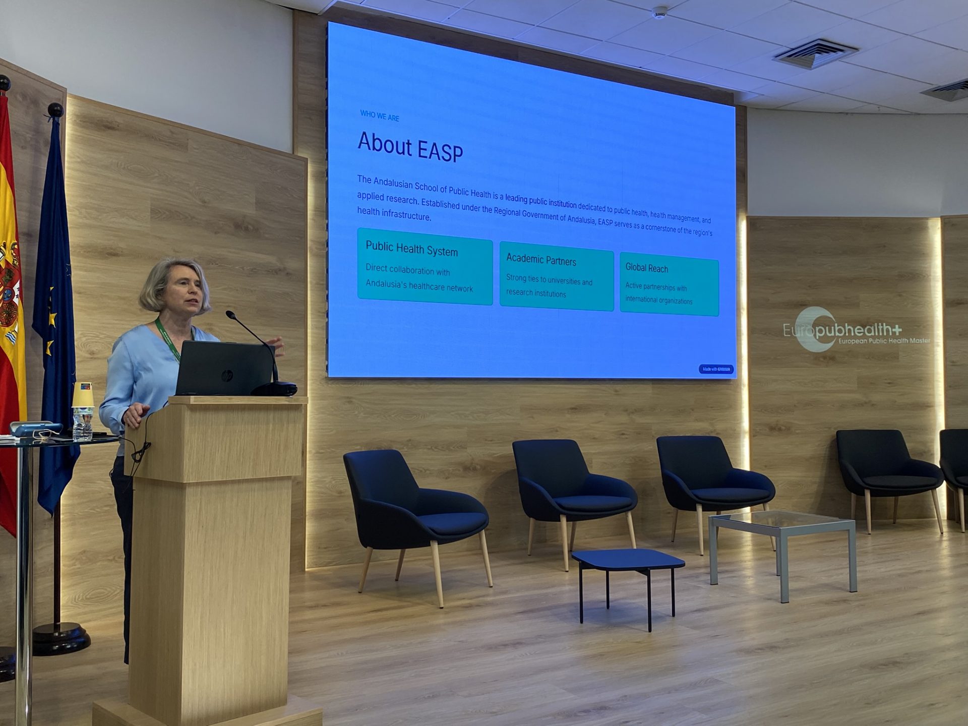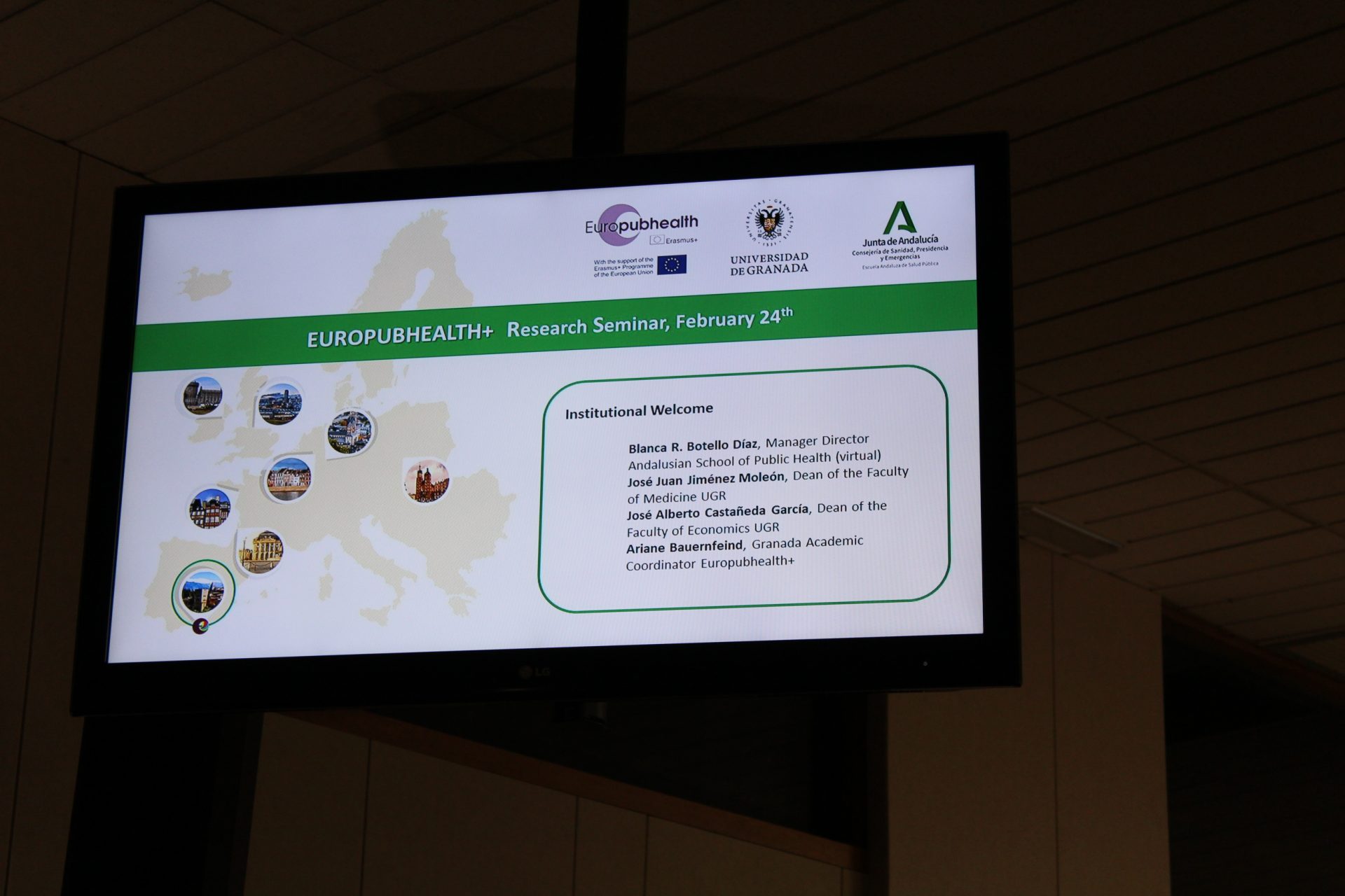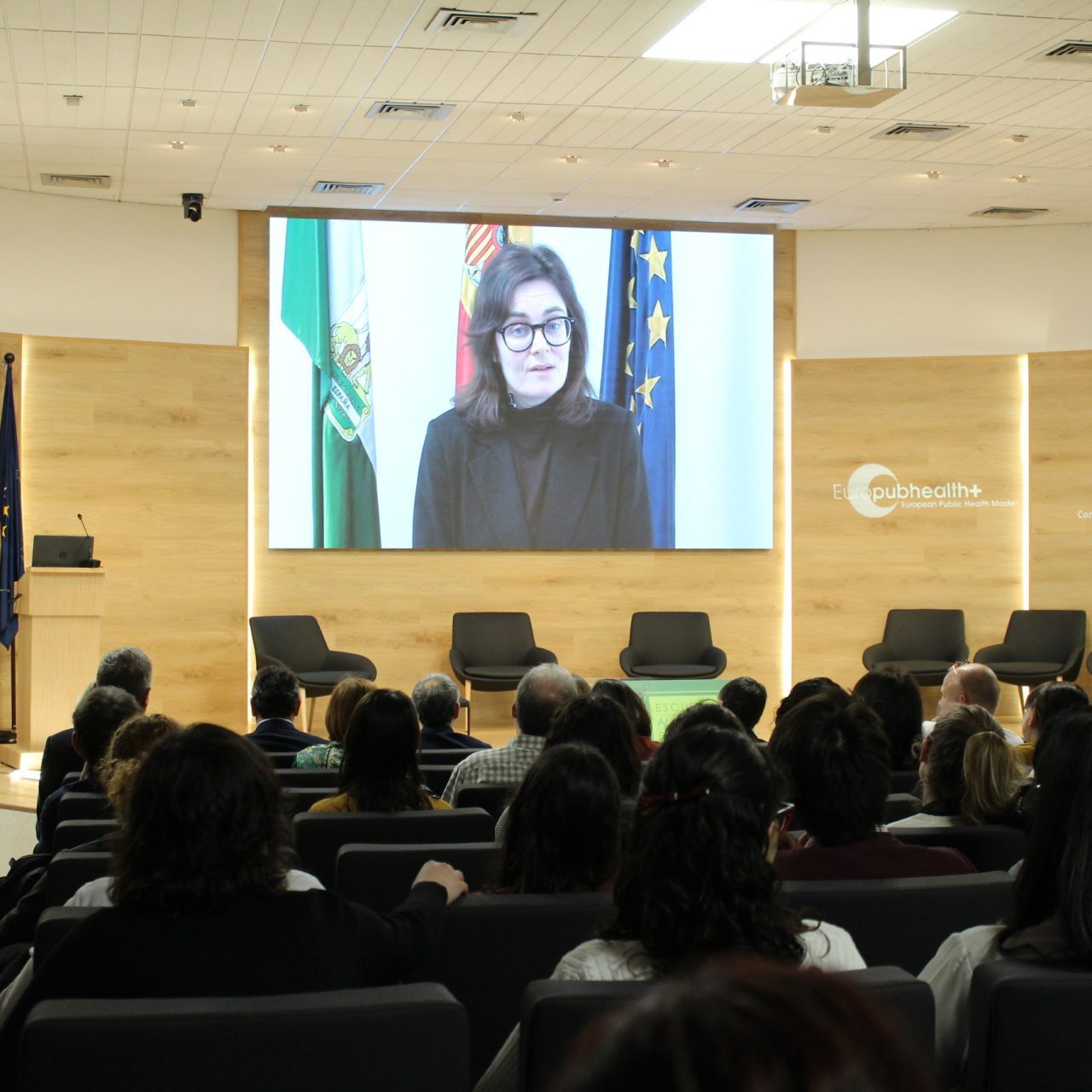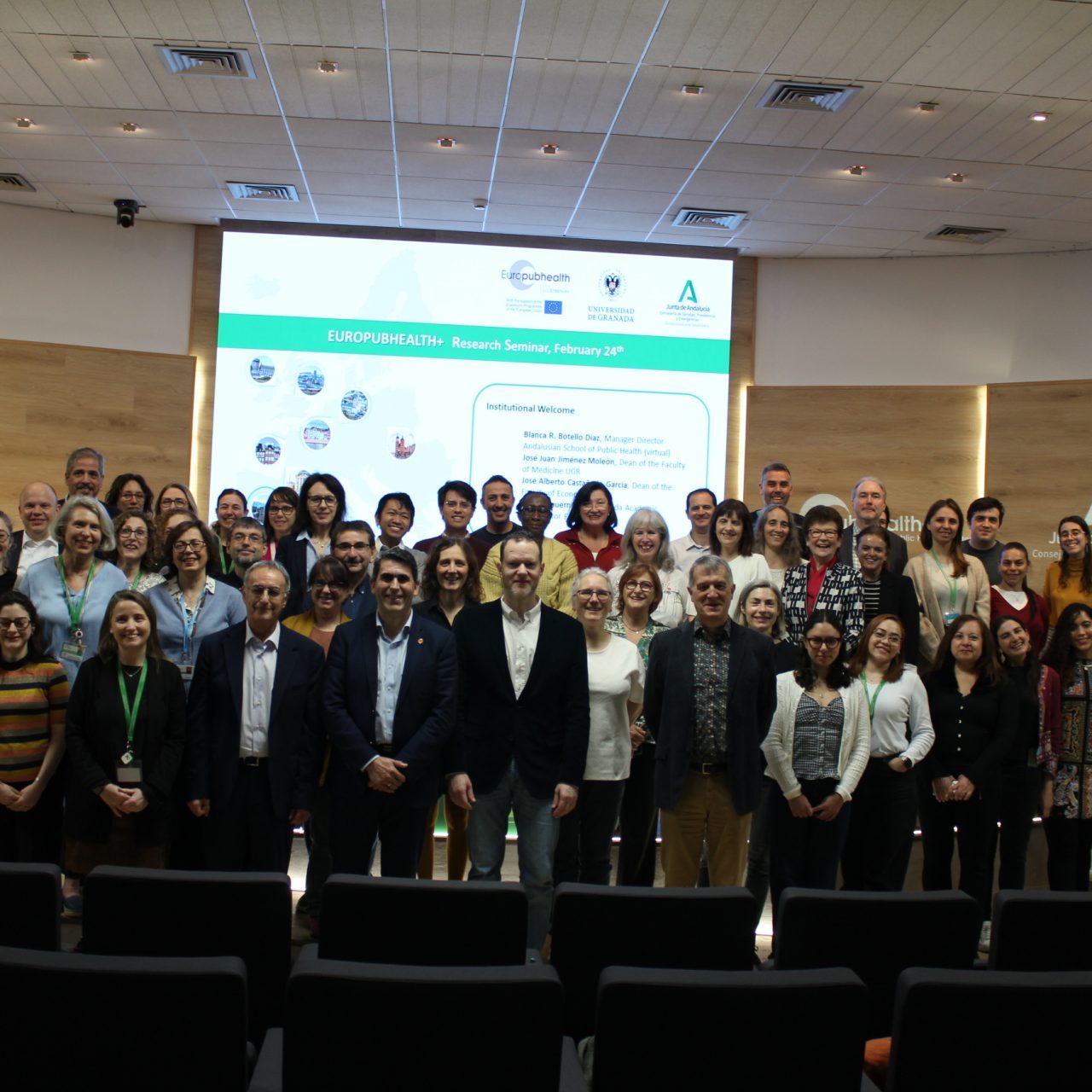 La sesión central ha comenzado con la bienvenida institucional, en la que han participado la directora gerente de la Escuela Andaluza de Salud Pública, Blanca R. Botello; el decano de la Facultad de Ciencias Económicas y Empresariales de la Universidad de Granada, José Alberto Castañeda García, y la coordinadora académica de Europubhealth+ en Granada, Ariane Bauernfeind.