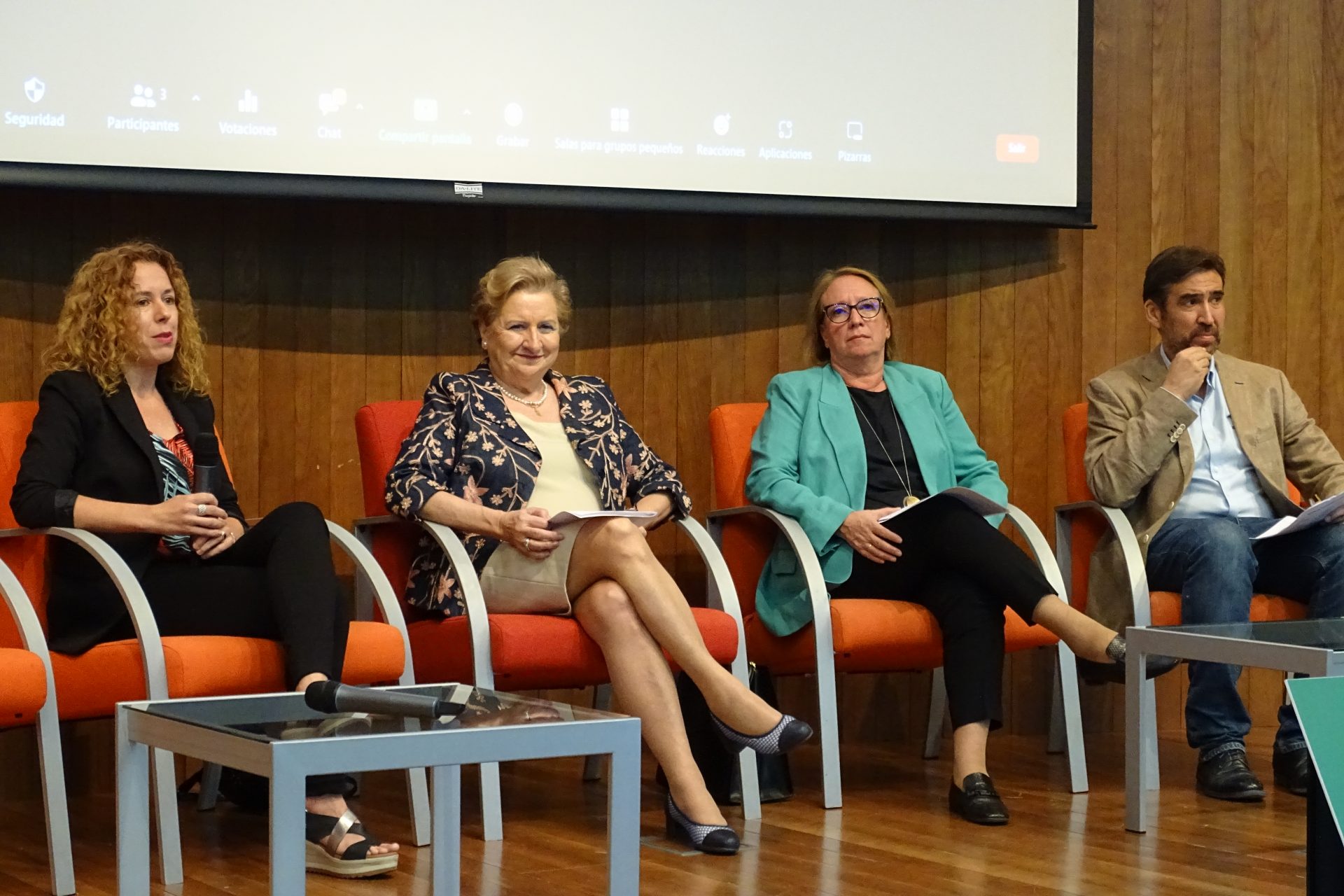 La directora gerente de la EASP, Blanca Fernández-Capel en la mesa de bienvenida a los asistentes junto la jefa de servicio de Vigilancia y Salud Laboral de la Consejería de Salud y Consumo, Isabel Vázquez; la jefa de servicio de Salud. de la Delegación Territorial de Salud y Consumo, María del Mar Mochón; el presidente de la Sociedad de Medicina Preventiva y Salud Pública en Andalucía. Rafael Martínez Nogueras y el presidente de la Sociedad Española de Epidemiología, Óscar Zurriaga.