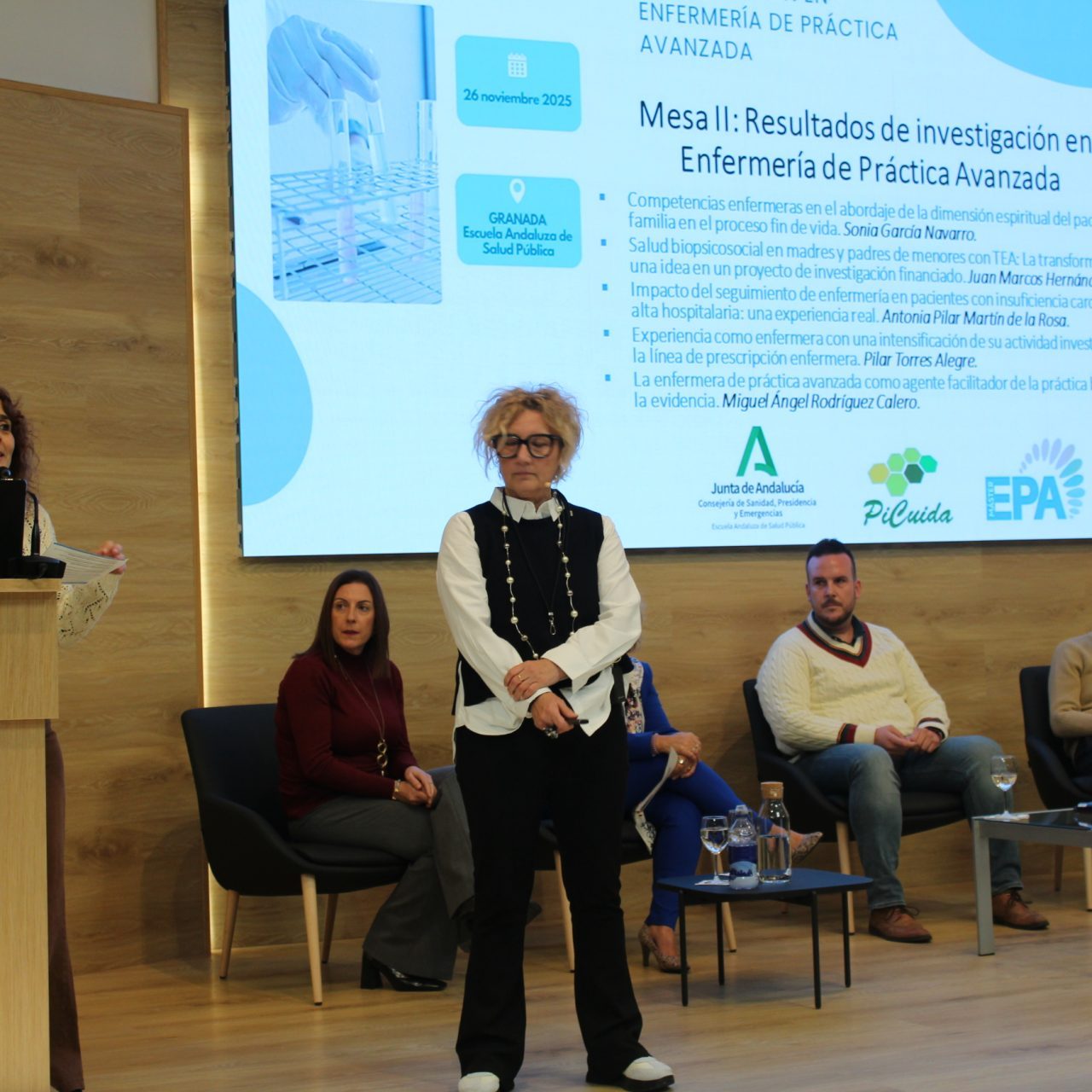 La apertura institucional ha contado con la participación de Blanca Botello, directora gerente de la EASP, y Susana Rodríguez Gómez, Subdirectora de Cuidados, Atención Sociosanitaria, Salud Mental y Adicciones, quienes han subrayado el valor de la investigación como motor de avance profesional y como garantía de calidad para el sistema sanitario público y especialmente, la necesidad de visibilizar los resultados de la investigación que demuestran el valor aportado por estos roles enfermeros de práctica avanzada en relación a la atención prestada a la ciudadanía.