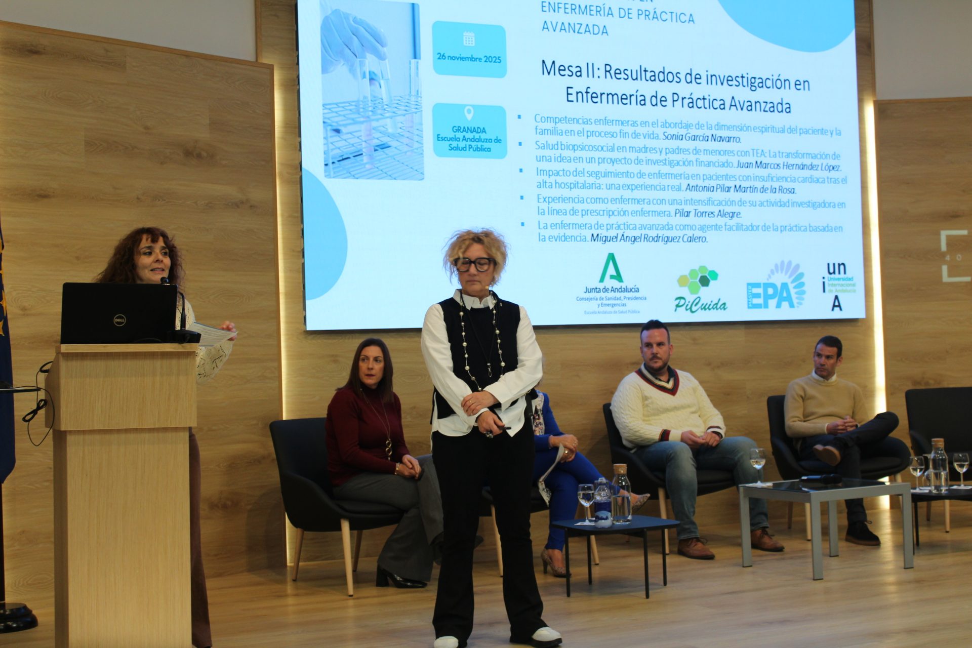 La apertura institucional ha contado con la participación de Blanca Botello, directora gerente de la EASP, y Susana Rodríguez Gómez, Subdirectora de Cuidados, Atención Sociosanitaria, Salud Mental y Adicciones, quienes han subrayado el valor de la investigación como motor de avance profesional y como garantía de calidad para el sistema sanitario público y especialmente, la necesidad de visibilizar los resultados de la investigación que demuestran el valor aportado por estos roles enfermeros de práctica avanzada en relación a la atención prestada a la ciudadanía.