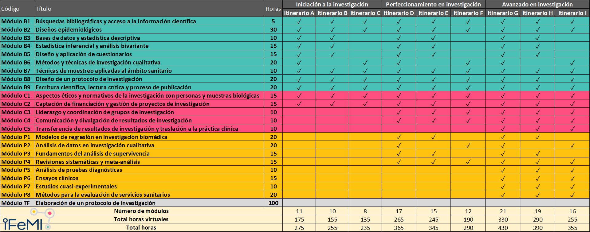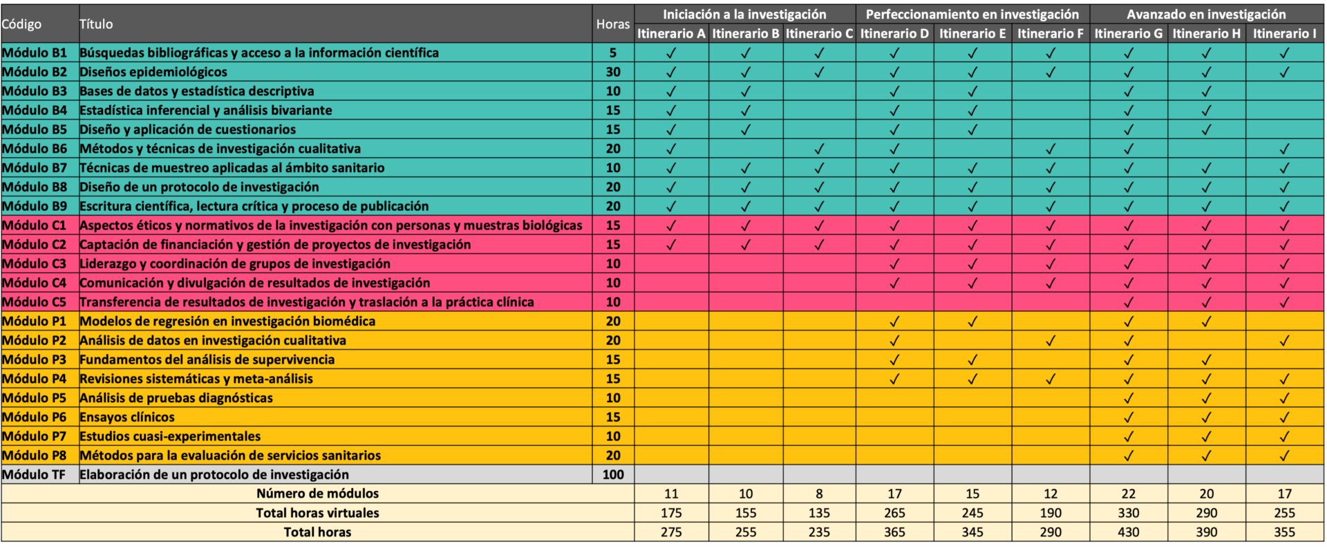 Este programa de formación tiene un diseño virtual, con una configuración modular junto con una serie de sesiones síncronas de refuerzo a lo largo de todo el itinerario. Como trabajo final se espera la entrega de un protocolo de investigación que pueda ser presentado en una convocatoria pública de investigación de concurrencia competitiva. El programa se completa con una tutorización virtual durante el desarrollo de cada módulo, además de hasta 4 sesiones de tutorización individualizadas para el apoyo al desarrollo del trabajo final.