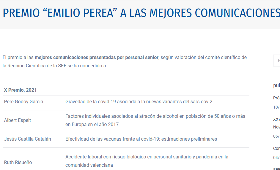 En esta décima edición de los premios, los trabajos reconocidos han sido ‘Gravedad de la covid-19 asociada a las nuevas variantes del sars-cov-2’; ‘Factores individuales asociados al atracón de alcohol en población de 50 años o más en Europa en el 2017’; ‘Efectividad de las vacunas frente al covid-19: estimaciones preliminares’; ‘Accidente laboral con riesgo biológico en personal sanitario y pandemia en la comunidad valenciana’.