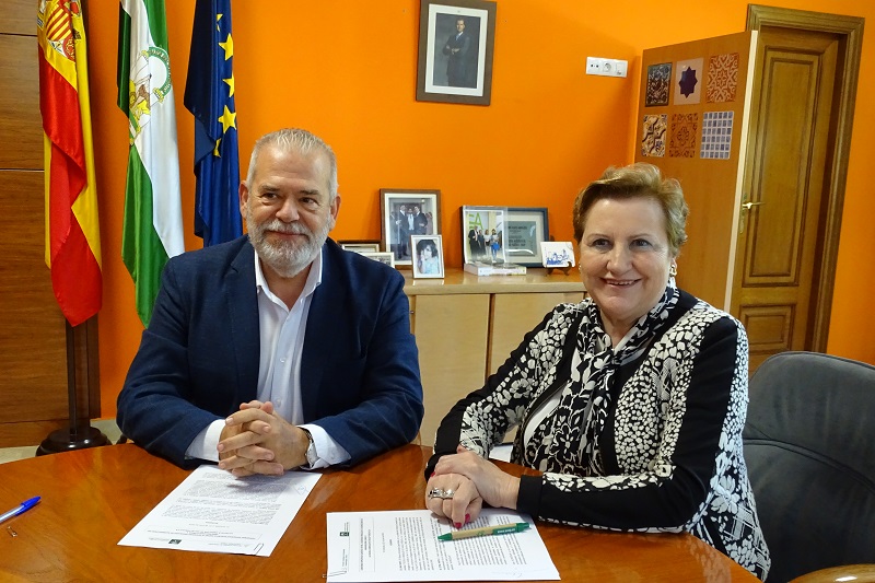 La directora gerente de la EASP, Blanca Fernández-Capel junto al presidente de Alergosur, Pedro Guardia, cerrando el acuerdo de trabajo entre ambas instituciones.