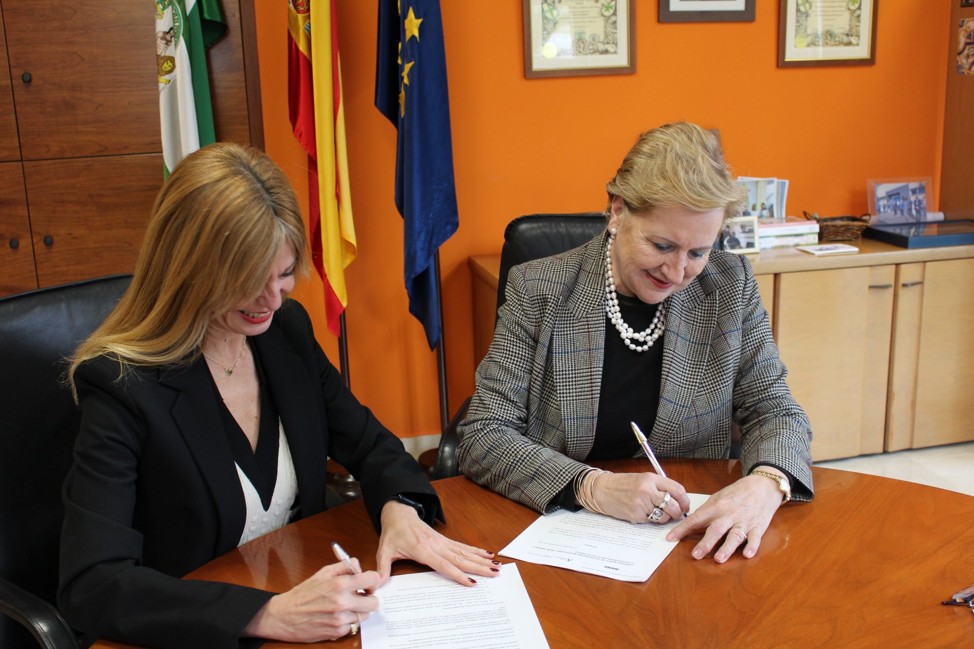 La directora gerente de la Escuela Andaluza de Salud Pública, Blanca Fernández-Capel y en representación de Amgen, María Fernández, directora de Acceso, han sido las encargadas de firmar este acuerdo de colaboración.