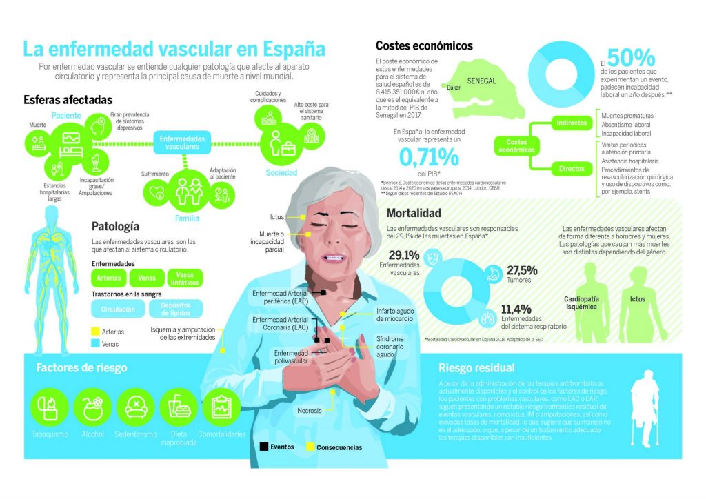 Las enfermedades vasculares, junto con los tumores, suponen una de las cargas sociales y económicas más importantes dentro de nuestra sociedad. En España, los gastos directos e indirectos asociados a la enfermedad vascular representan el 0,7% del PIB y suponen un 9% del gasto sanitario global. En términos cuantitativos, este dato equivale a un total de 8.415 millones de euros de gasto anual. El impacto económico directo se centra en la atención en hospitales, centros de atención primaria o uso frecuente de medicamentos y material quirúrgico. Entre los costes indirectos se incluirían factores como muertes prematuras, absentismo laboral o incapacidad. Según datos recientes del Estudio REACH el 50% de los pacientes que experimentan un evento vascular, ya no trabajan al transcurrir un año. Una cifra que duplica los datos de la población general.