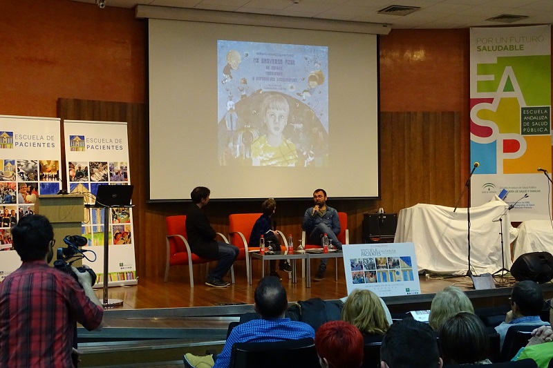 Mesa inicial del VII Congreso de Pacientes con David Gómez y su hijo Sergio contándonos el proceso de creación de su libro «Mi universo azul»